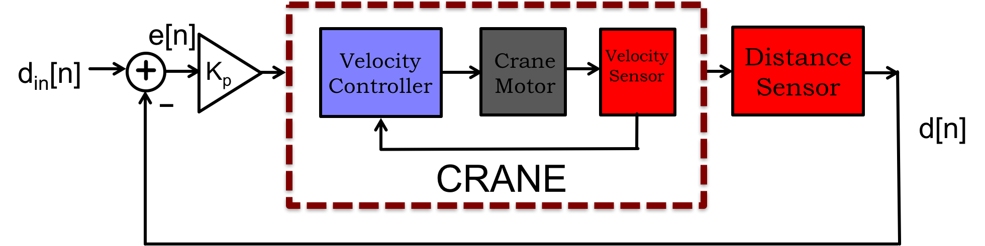 A proportional feedback approach to controlling the crane's position would be to make the crane velocity proportional to the difference between the desired and measured crane positions, as diagrammed for the DT case in the figure above. Then the velocity is given by