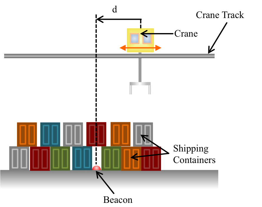 Suppose the cranes are being independently monitored with remote LIDAR, which measures the distance between the crane and the beacon every ten seconds. A test was run using the CT controller with an unknown proportional gain K_p, in which two consecutive measurements from the LIDAR system (which we can denote as d(t) and d(t+10)) gave distances of 200 meters and then 10 meters between the beacon and the crane.