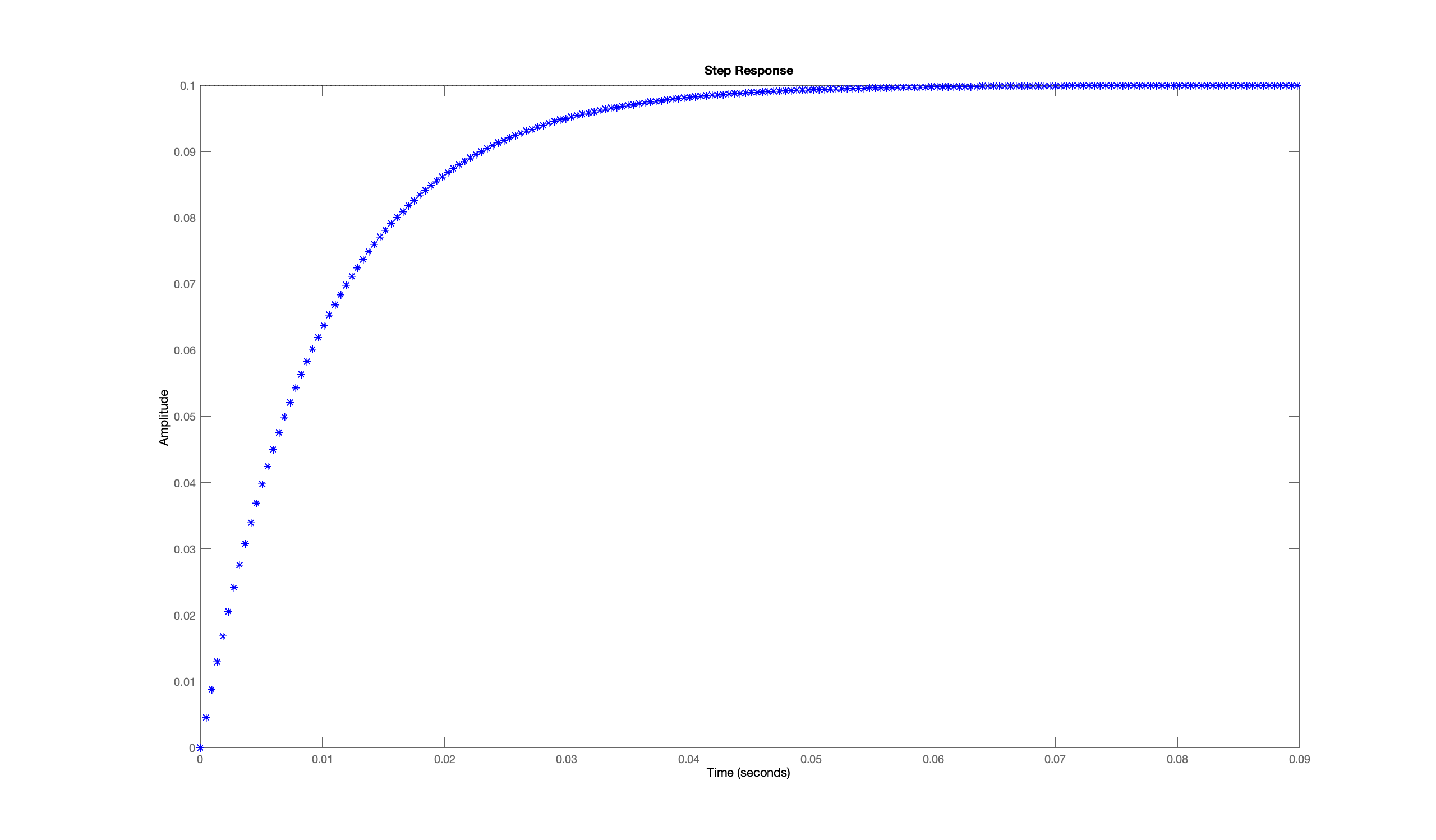 A plot of the step response for b = 10 and \lambda = -100 is given below. Note that the step response settles to \frac{b}{-\lambda} as t \rightarrow \infty, and has risen to about two-thirds of the steady-state at t \approx \frac{1}{-\lambda}.
