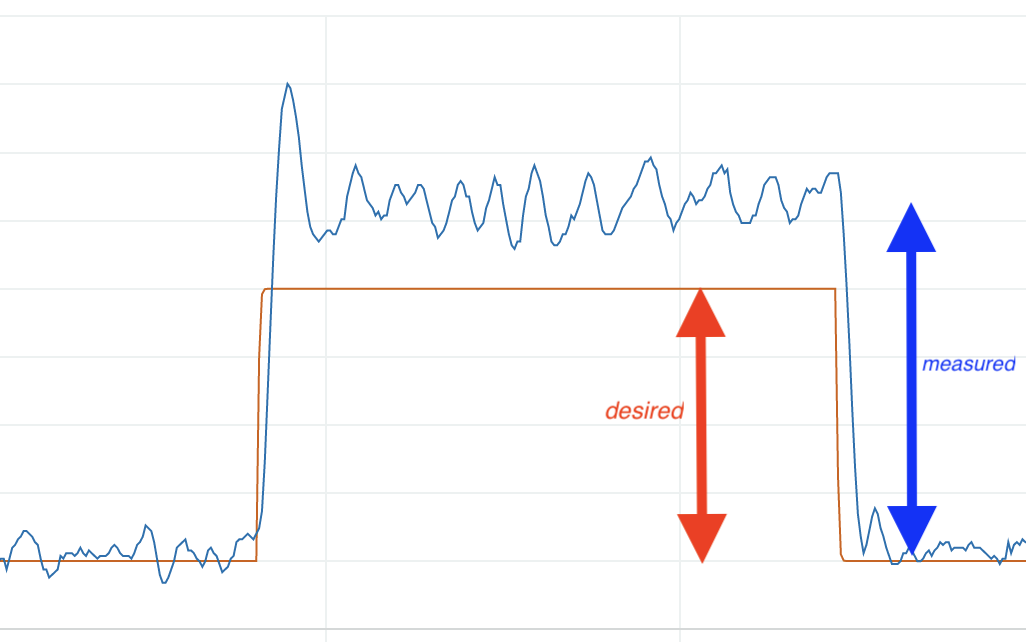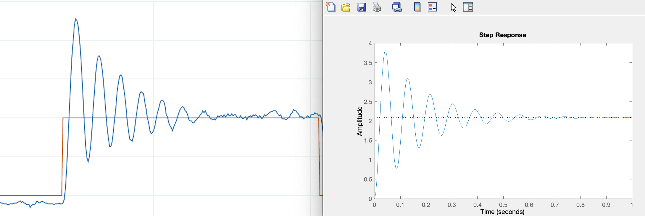 In the figure above, we show annotatation for a plot extracted from the Arduino serial plotter, generated by running the maglev control system with a PD controller. The plot, a comparison of the quasi-steady-state peak-to-peak amplitudes of the desired (red) and measured (blue) umbrella positions, can be used to determine \gamma_{da/dy}. Try determining the formula for the step response steady-state, and then matching.