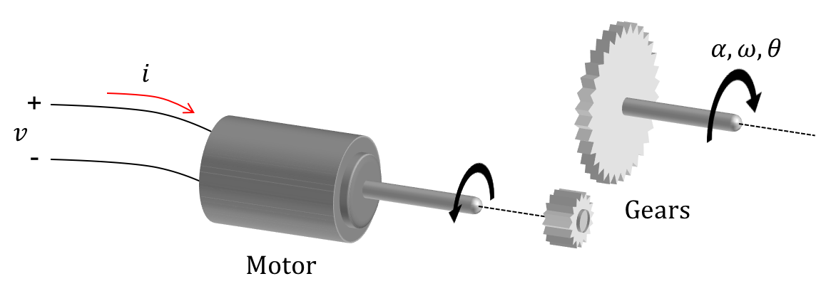 The Lmotor is a geared brushed motor, just like the propeller motor. By changing the motor voltage, v, we change the motor current, i_m, which is proportional to the torque generated by the motor. The net arm torque, a sum of motor-, gravity-, and elastic-generated torques, results in an arm rotation characterized by angular acceleration, \alpha, angular velocity, \omega, and rotation angle \theta, as shown in the figure below.