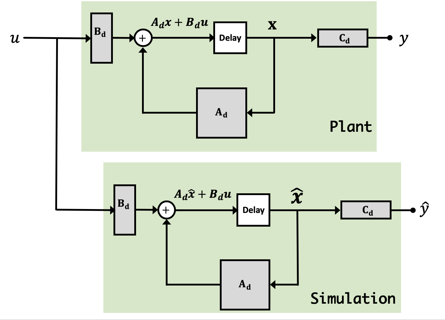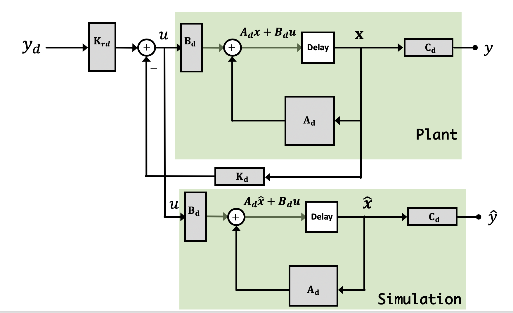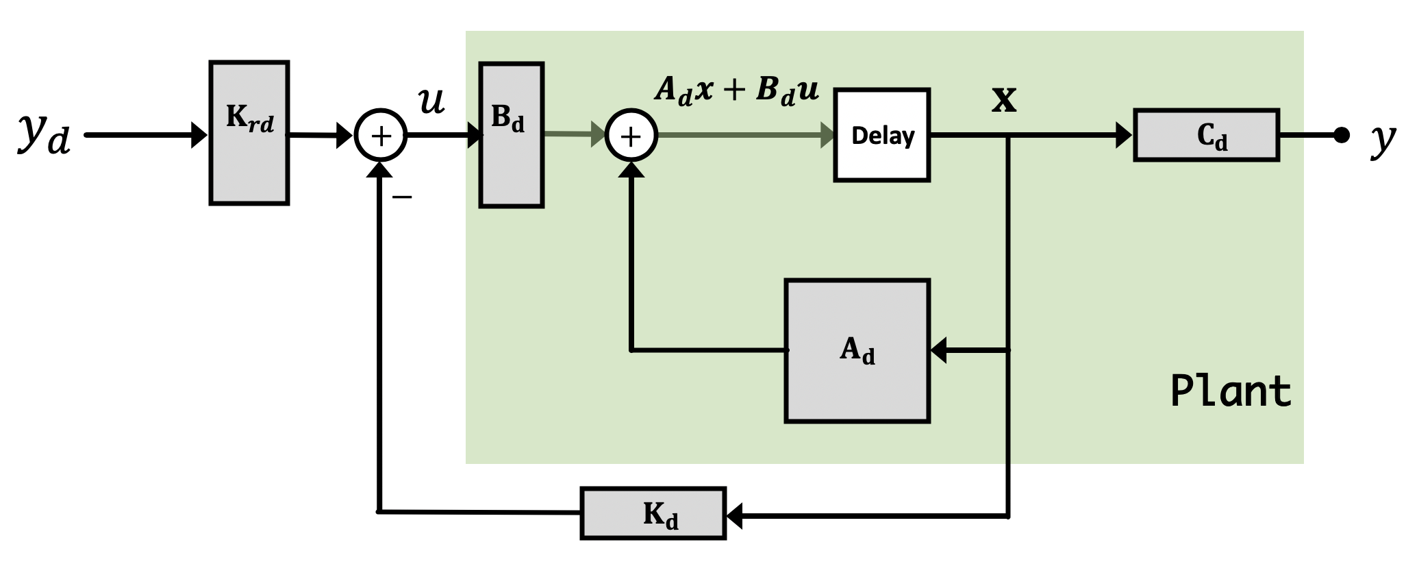 - \textbf{x}[n+1] = \textbf{A}_d\textbf{x}[n] + \textbf{B}_du[n]