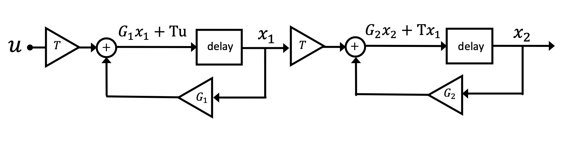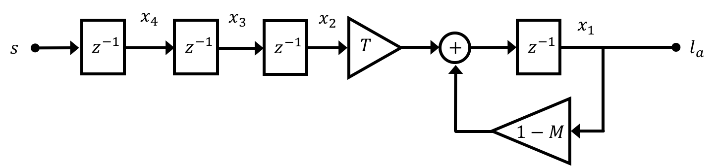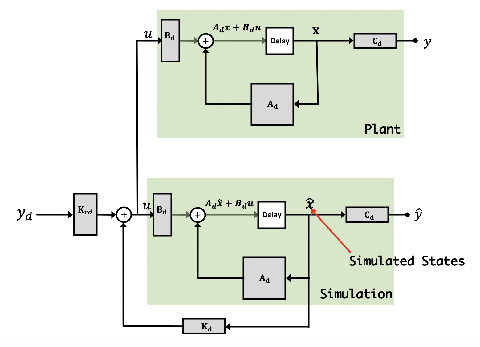 - \textbf{x}[n+1] = \textbf{A}_d\textbf{x}[n] + \textbf{B}_du[n]