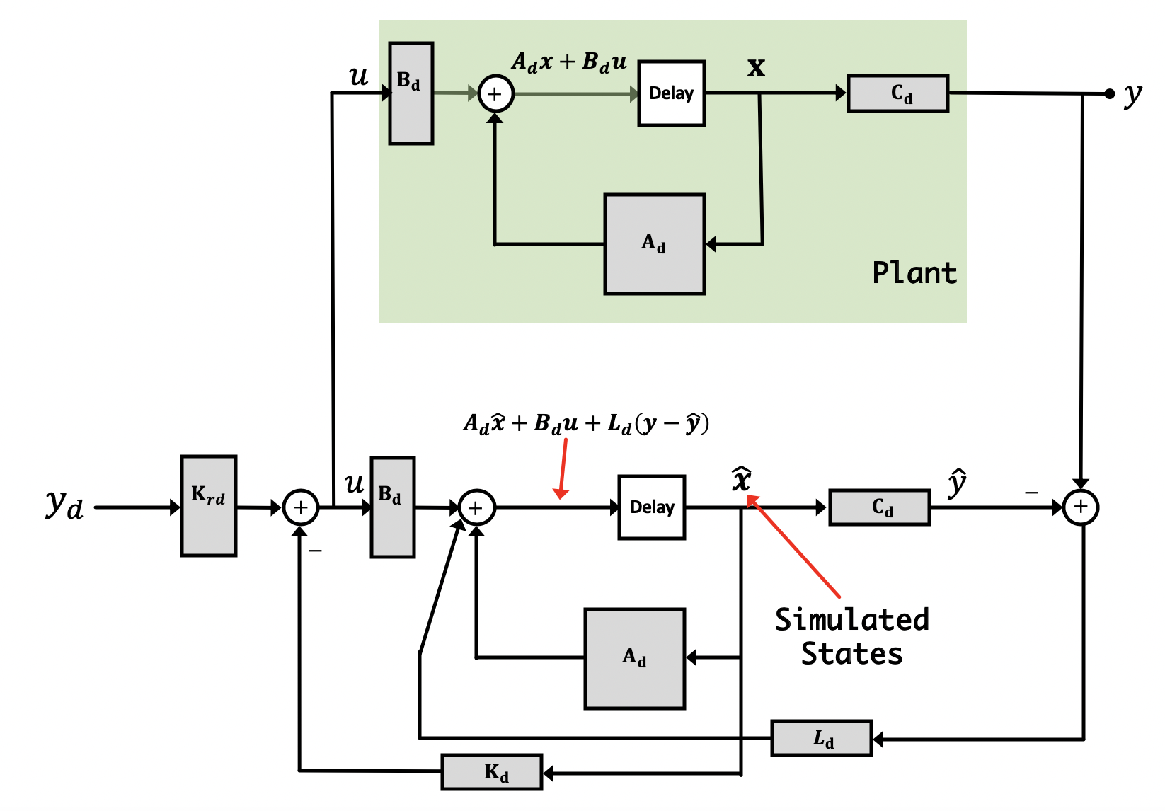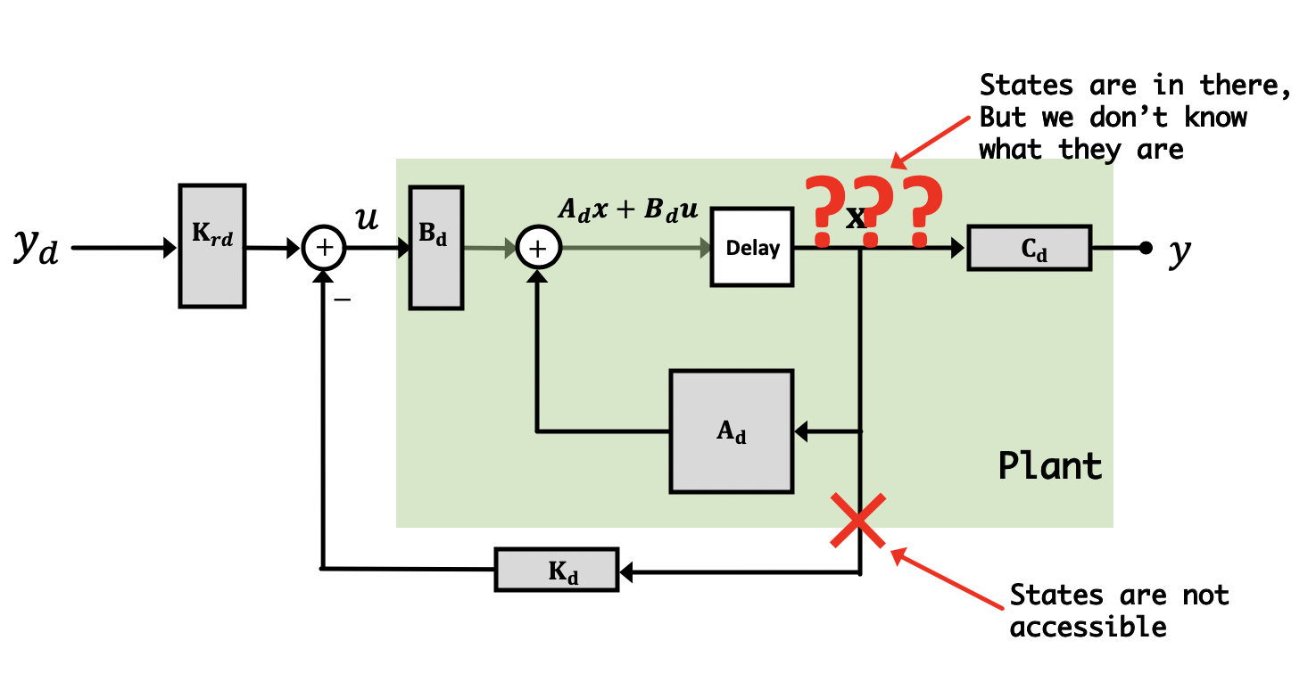 Now why are we doing this? Because the observer is a simulation, we have access to all "parts" of it, including the states. If we can make sure that our simulation accurately reflects the behavior of the real system, it probably means that the states of our simulated system are similar to what the actual states are. If this is so, we can use these simulated states to fill in for the "real" states that we cannot get access to from our real plant. We can multiply these estimated states by a gain vector \textbf{K}_d in just the same way as we were doing with our regular states from before. Diagramatically what we're doing is illustrated below:
