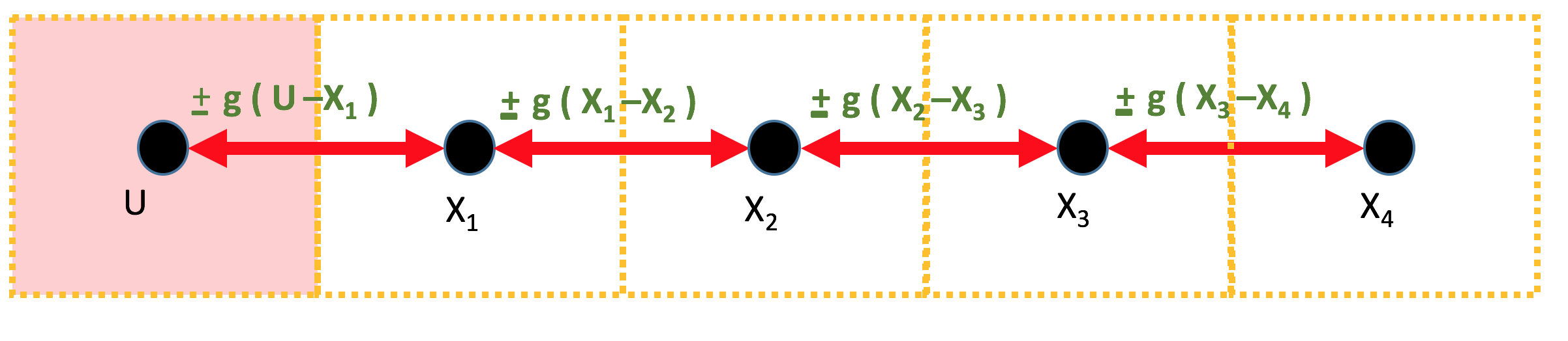 Having encapsulated the physical details in g, the equations for the temperature change in one sample period, T, are not complicated. The change is equal to the product of the period length and the difference between the "flow" in from the left, and the "flow" out to the right. That is,