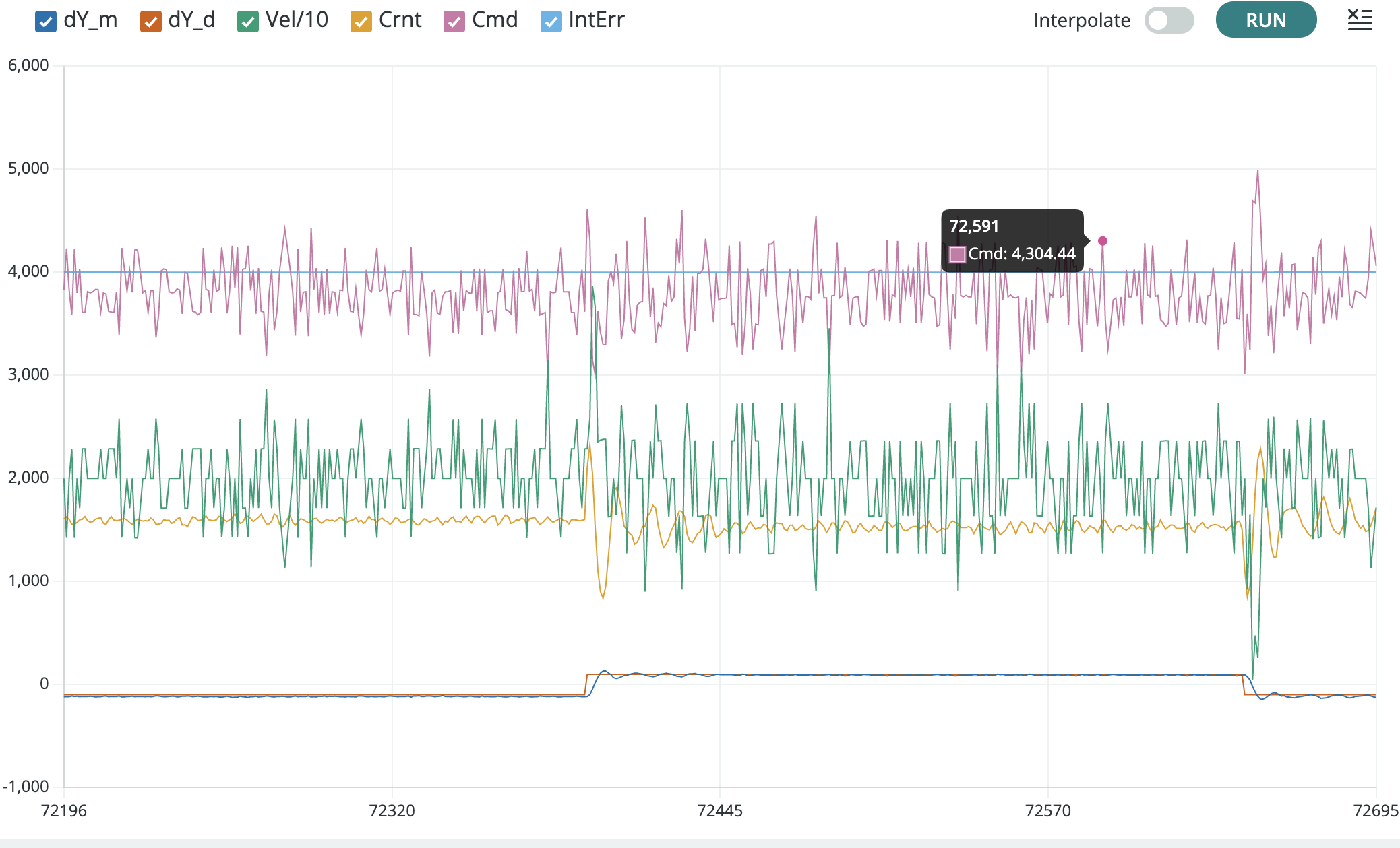 In the Teensy serial plotter, you can unclick all but \Delta y and \Delta y_d, to focus in on position errors, as shown below.