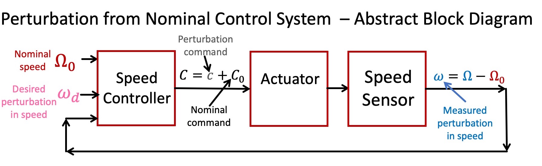 Recall that when first experimenting with the speed control system, we turned a small potentiometer to adjust a nominal motor command, C_0 (nomCmd in the Teensy sketch), to set a nominal motor speed, \Omega_0 (nomOmega in the sketch). We then perturbed the motor command (e.g. by setting non-zero feedback or feed-forward gains) and measured the perturbation in motor speed. In order to model our system more precisely, we will use lower case letters to denote perturbations from nominal,