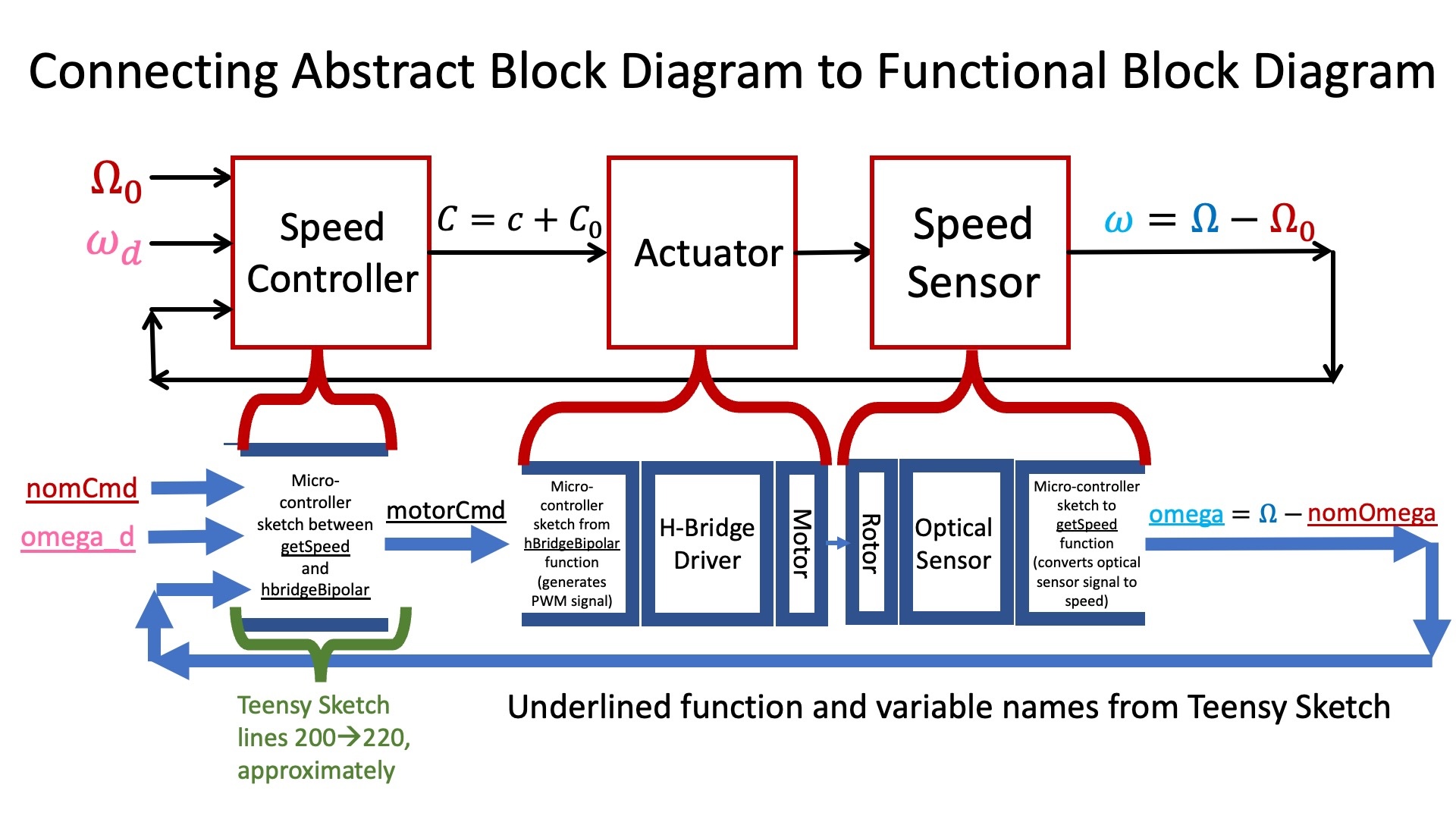 In the case of our speed control system, we can extract an abstract model like the one above provided we ignore the structural boundaries. The speed sensor is a combination of the white eight-bladed encoder, the optical sensor, and the function getSpeed in the Teensy sketch (which converts the time between falling edges in the optical sensor output into speed estimates, see the next section). The actuator in the abstract diagram is a combination of the function hbridgeBipolar in the Teensy sketch (which converts a motor command into a pulse-width-modulated signal), the h-bridge driver, and the motor connected to the white encoder.