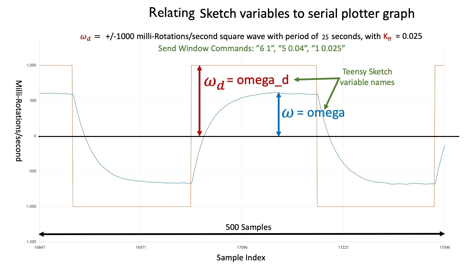 As we can see from the figure in the previous subsection, there is a small part of the Teensy sketch that corresponds to the speed-controller block in the abstract block diagram. The actuator command, motorCmd in the sketch, is computed from the nominal command, nomCmd in the sketch, the desired perturbation in motor speed, omega_d in the sketch, and the measured perturbation in motor speed, omega in the sketch. To make the meaning of omega and omega_d clearer, consider the example plot below. The plot was generated by running the speed control system in control mode (MODE 1), with omega_d set to be a unit amplitude square wave, the controller gain kff set to 0.025, and the square wave frequency set to \frac{1}{25}.