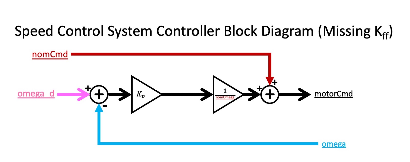 Below we show an incomplete block diagram for the controller, showing how the motor command is computed from the desired and measured motor speeds, as well as the nominal command (which is just added in). The block diagram shows how K_p, the proportional feedback gain, affects the motor command, but does not show the effect of K_{ff}. We will consider adding K_{ff} later in the lab.