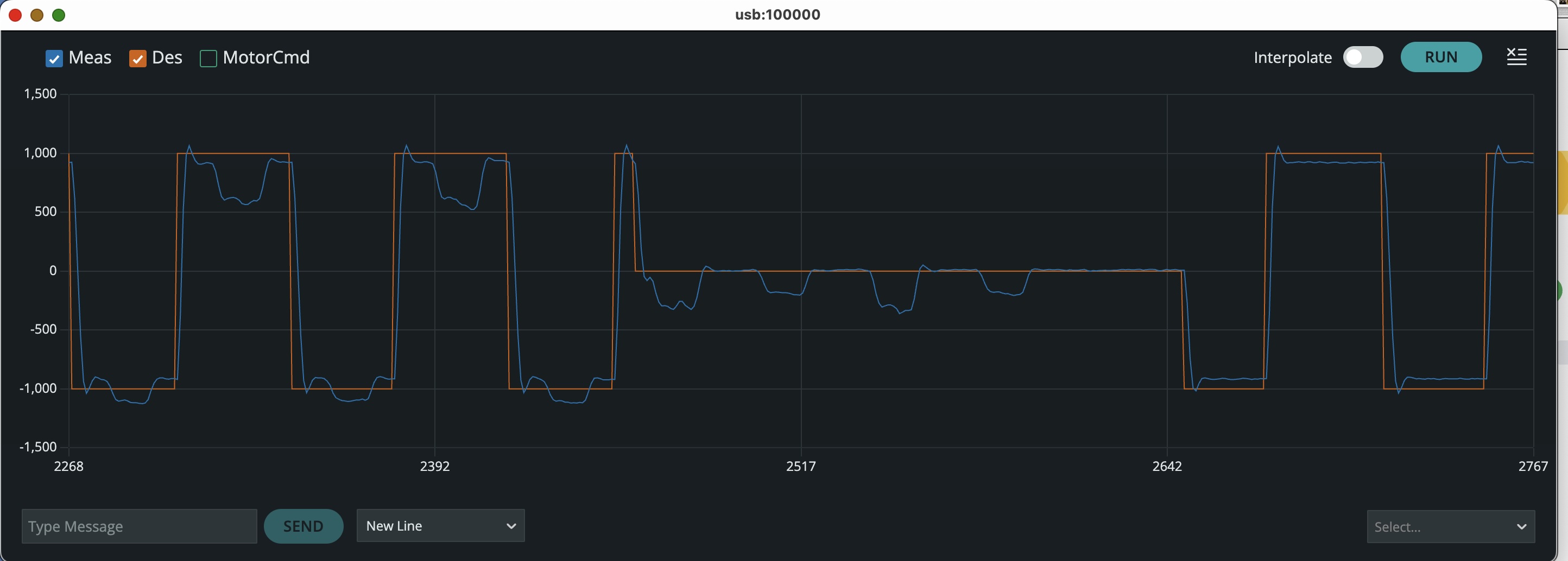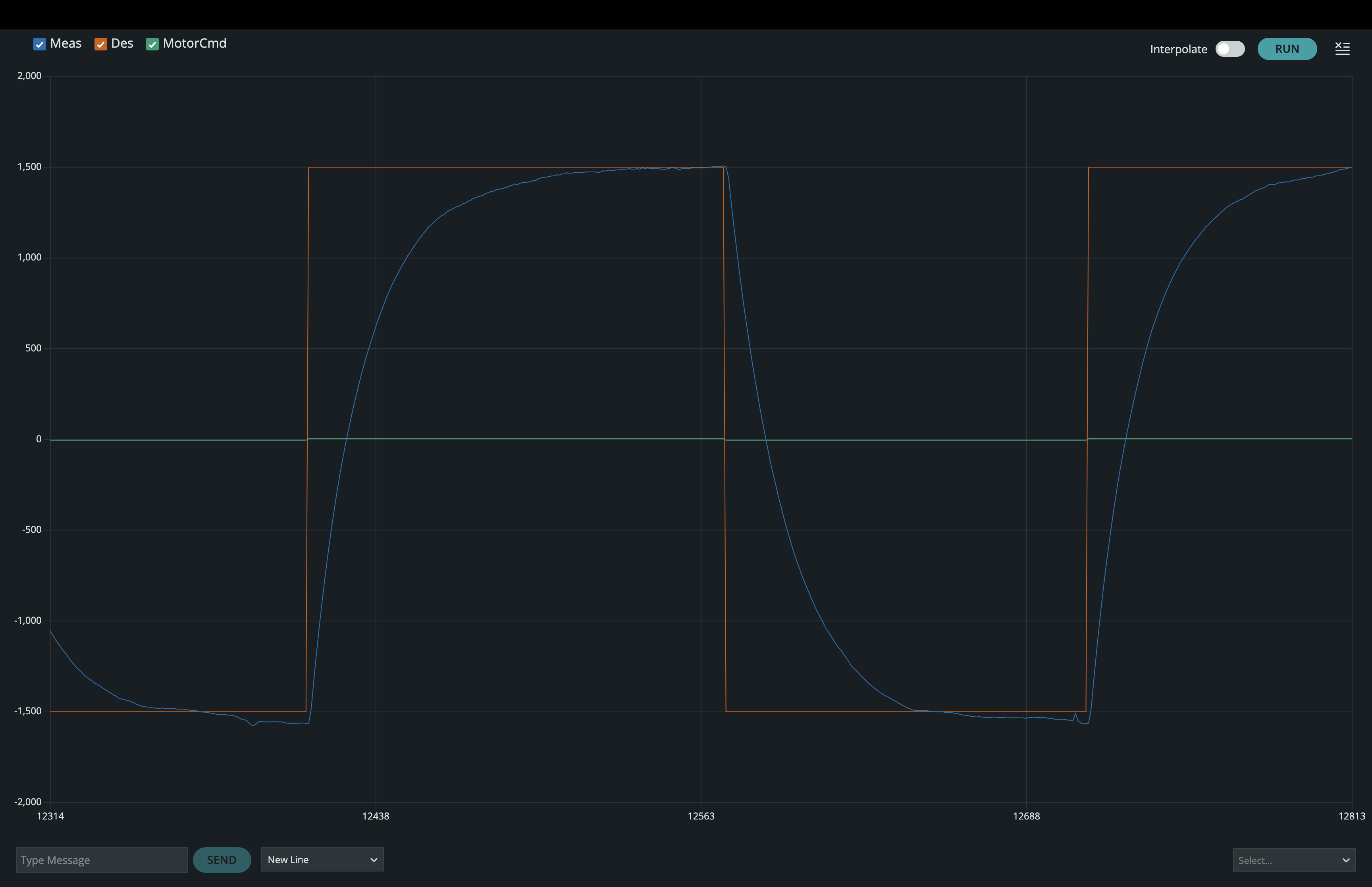 disturbAon line 14 of the sketch to zero, and reupload the sketch. Then use the send window to set the input amplitude (index 6) to 1,freq(index 5)to 0.2,repeats(index 4)to 3, and adjust K_p (index 3) so that on the falling transition, the motor speed oscillates three or four times before settling. Take a screenshot of the plot to use for prelab2. -