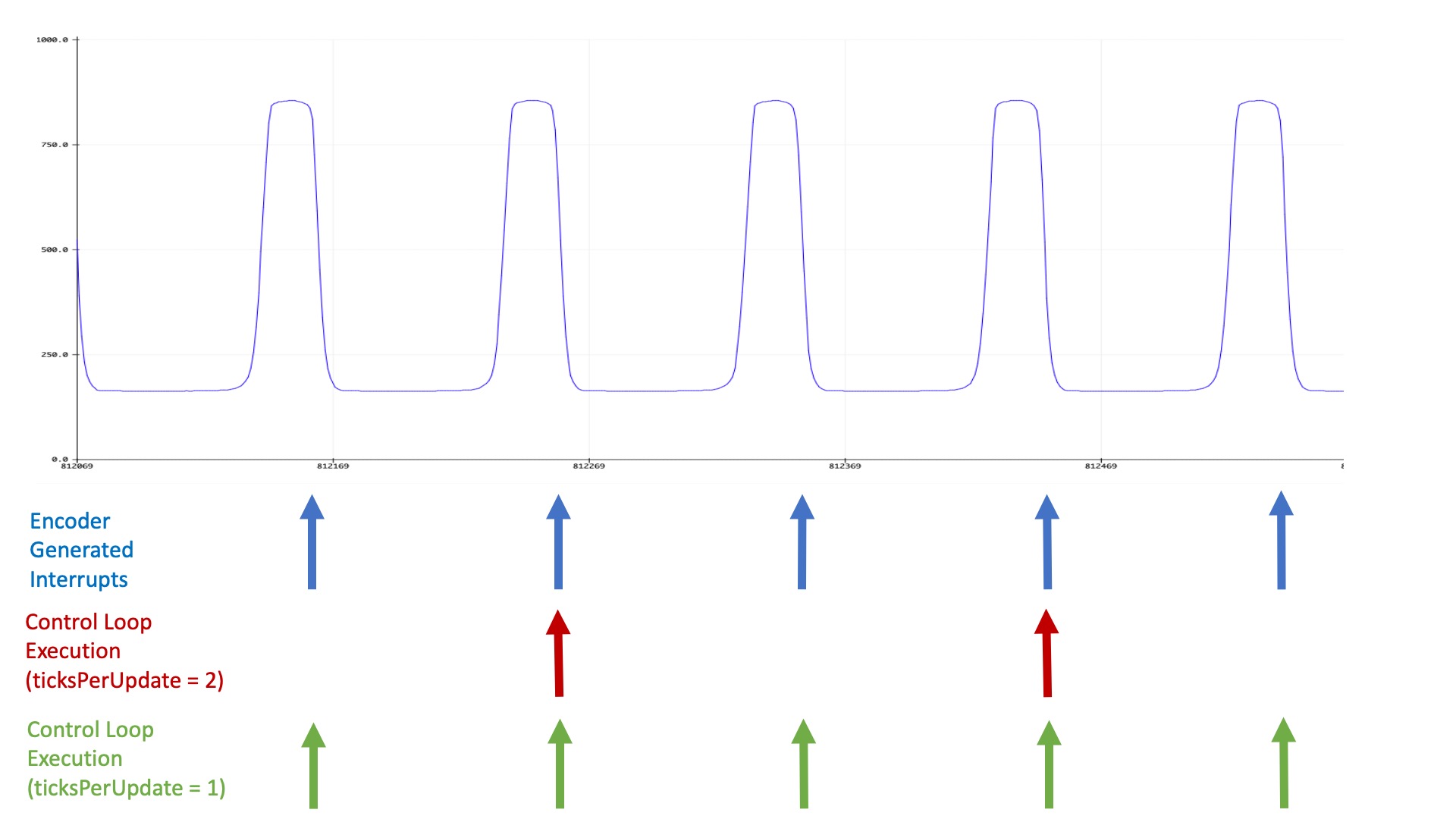 The signal generated by the optical sensor circuit is plotted below (notice the y-axis is normalized, so that 1000 corresponds to three volts), along with a diagram showing when interrupts are triggered on the Teensy, as well as when a control loop (which updates the motor command) executes. As the diagram should make clear, interrupts are generated every time an encoder blade passes under the optical sensor (eight times per rotation for our eight-bladed encoder), but the control loop only runs every m^{th} interrupt, where m is the setting of ticksperupdate (which you change from the serial plotter send window, by typing, e.g. "0 4" to set ticks per update to 4). Note that when ticksperupdate is zero, m is set to the maximum value of 8.