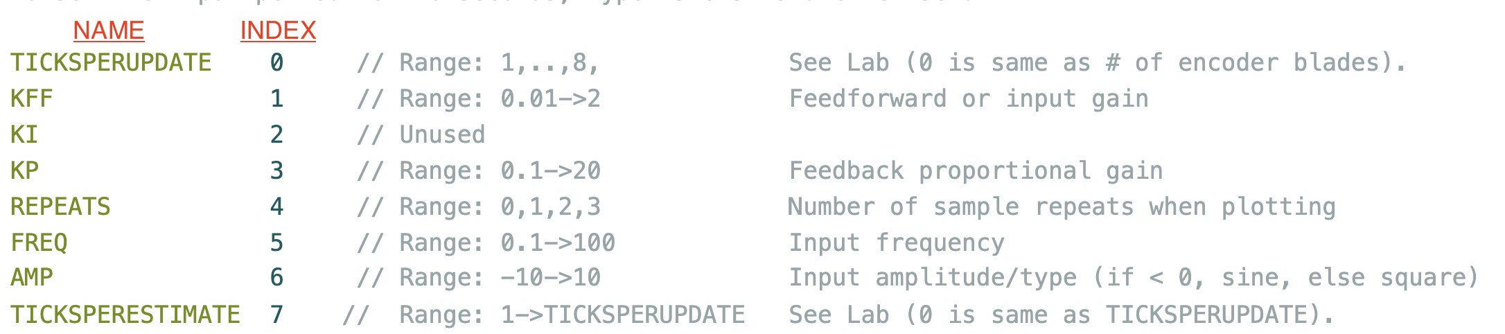 ticksperupdate,kff,kp,repeats,freq, andamp, andDisturbA(checkoff 2).