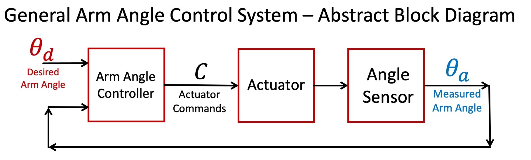 As the abstract block diagram (left panel above) suggests, controlling the rotation angle requires three interconnected functions, an actuator, a sensor and a controller. The angle sensor generates an analog voltage proportional to rotation angle, which is much more direct than the optical encoder sensor used for speed control. But the actuator is more complicated (right panel above). The controller sends commands to the motor and the resulting motor speed generates thrust on the rotating arm. The thrust accelerates the arm. The acceleration induces a change in arm velocity. And the arm velocity changes the arm angle. The layers of indirection make the control problem challenging, but not uncommonly so, most systems using force-based actuators are similar.