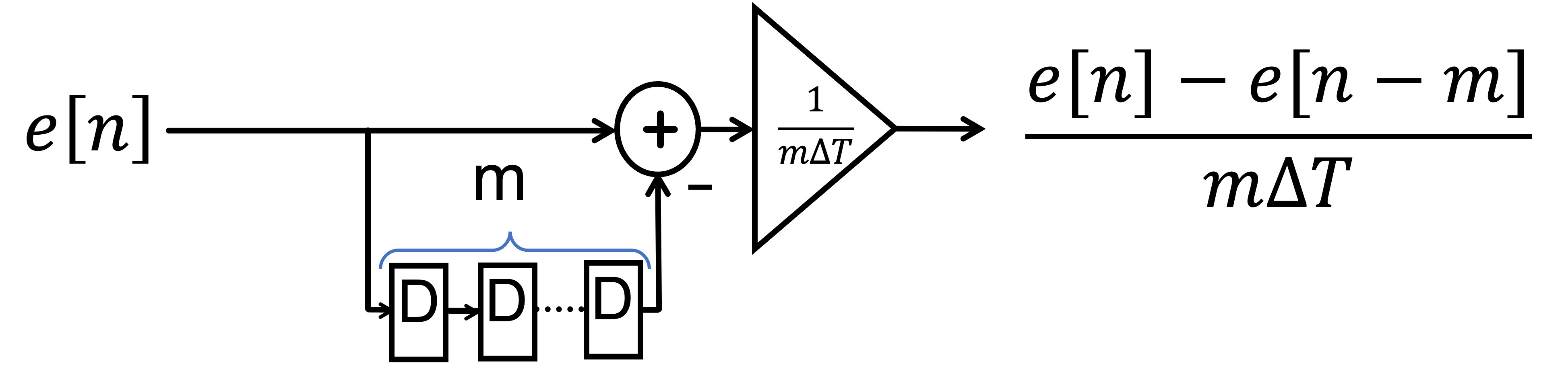 PID (Proportional, Integral, Derivative) controllers are ubiquitous in feedback systems, though for discrete-time systems, it would be more accurate to refer to such controllers as PSD (Proportional, Sum, Delta). An ad-hoc approach to designing a PSD controller is to select a proportional feedback gain, K_p, and then increase the gain of the Delta (or derivative) feedback, K_d, until the step response is sufficiently stable. Finally, add Sum (or integral) feedback, with gain K_i, to eliminate any remaining steady-state error.