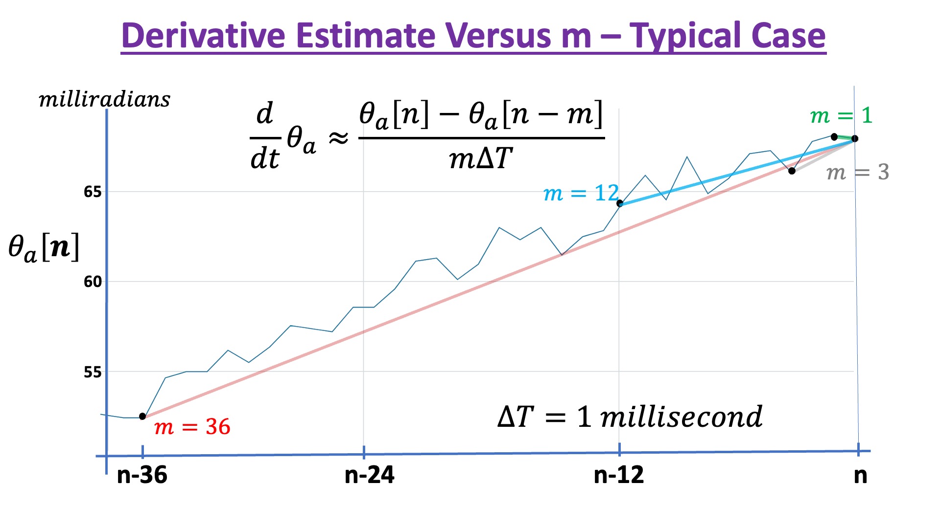 We can add a feedback term that is proportional an approximation of the derivative (the difference in a pair of angle measurements, i.e. the n^{th} minus the (n-m)^{th} sample, divided by the time between measurements, i.e. (m \Delta T). We have already seen experimentally that adding derivative feedback stabilizes the arm (when we made K_d nonzero), but there are other consequences. Arm angle derivatives typically change more rapidly than arm angle, so motor commands produced by proportional plus derivative (PD) controllers change more rapidly, rapidly enough to invalidate our model which assumed arm acceleration changes instantly with motor command. If we want to model PD control, we will need a more accurate model.