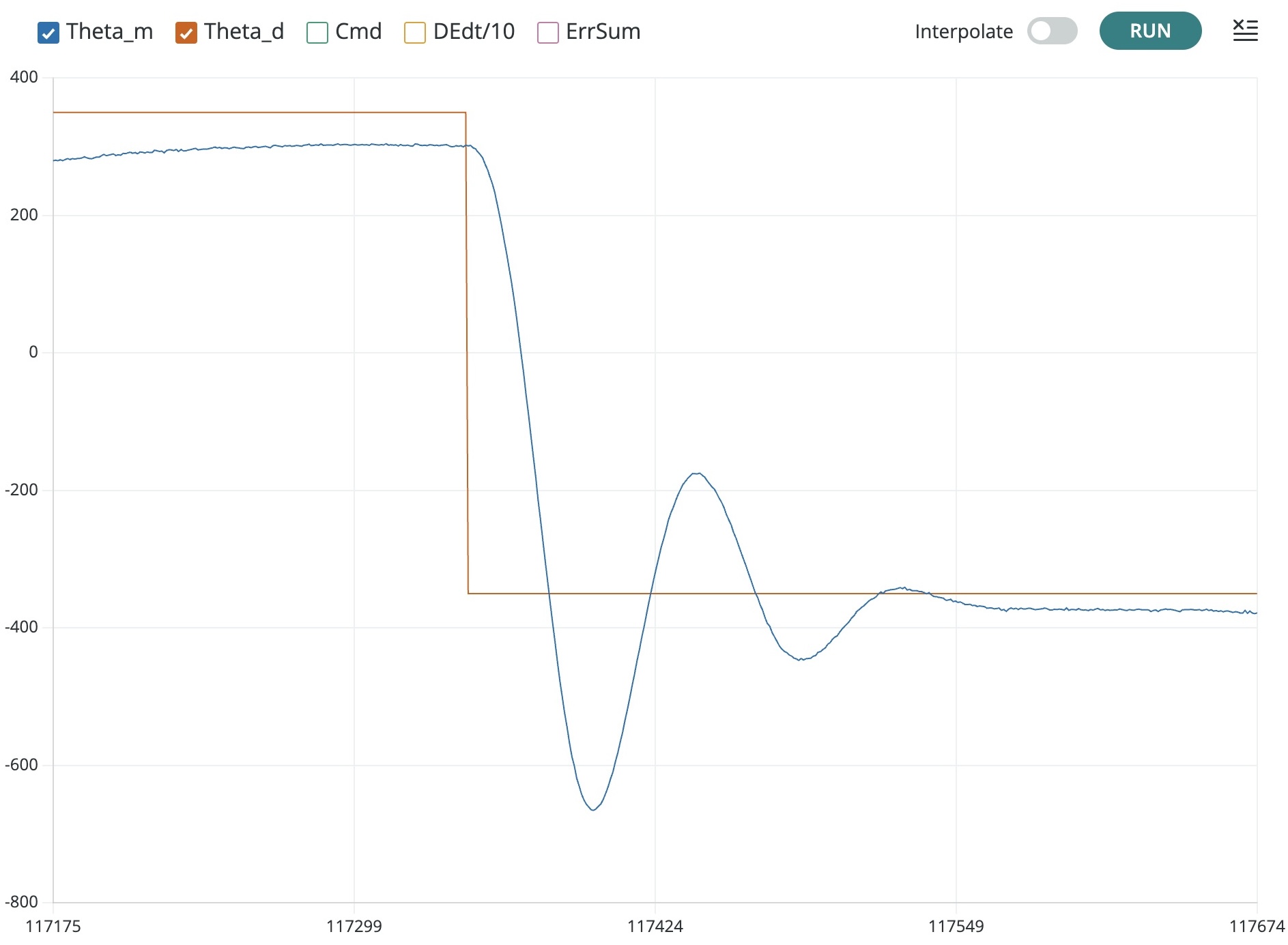 In Checkoff 2, you found the smallest K_p gain for which your arm produced a growing oscillations when started with a 60 milliradian offset from level. Redo the experiment to find the smallest K_p that produces growing oscillations, but use a starting offset of 150 milliradians, and then repeat your experiment using twice that K_p (we will refer to these gains as K_{p0} and 2K_{p0}). You will likely find that using a larger initial offset gives you a smaller K_{p0} than last week, so when you use 2K_{p0}, the arm should not be too unstable. During each experiment, be sure to pause the serial plotter quickly, so you can measure the oscillation periods (using the plotter's curser) when the growing oscillation amplitude is still small. Keep in mind that \Delta T = 0.001 seconds, and that the plotter plots every tenth sample (so there are one hundred plotted points per second).