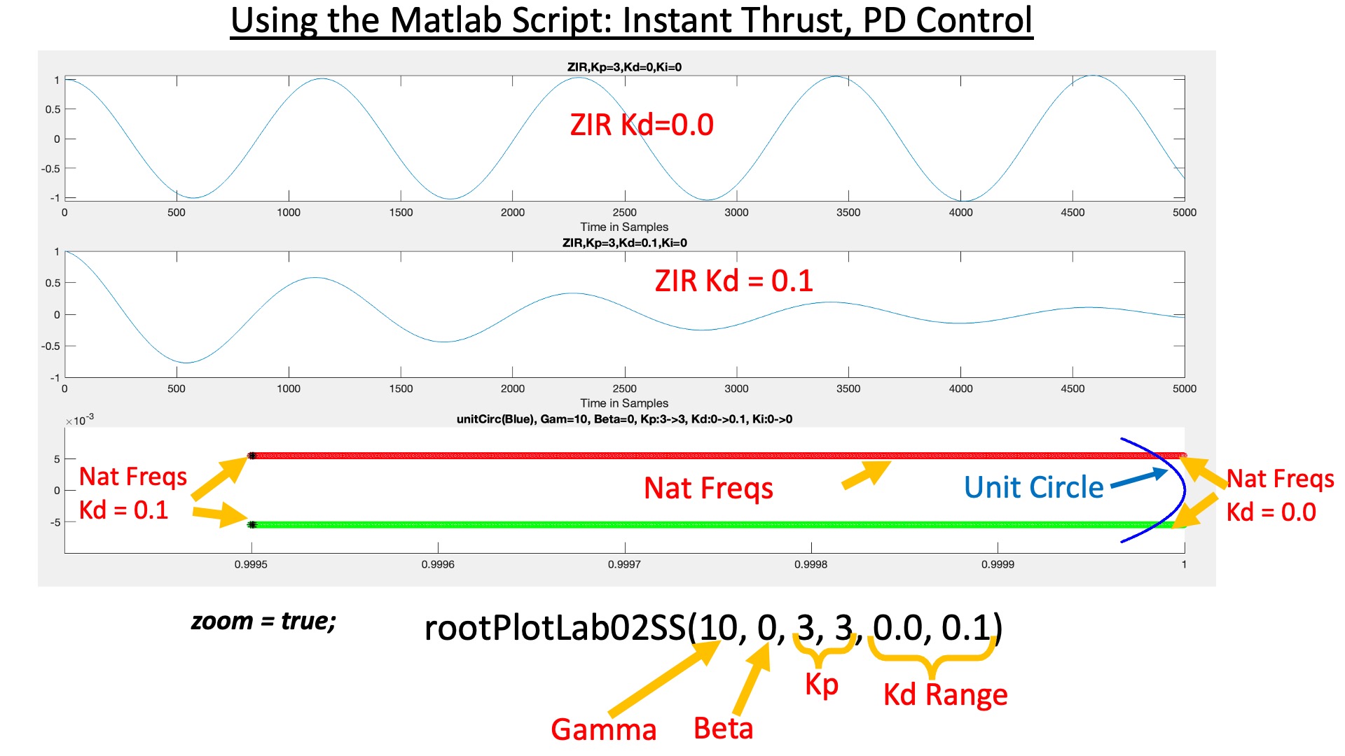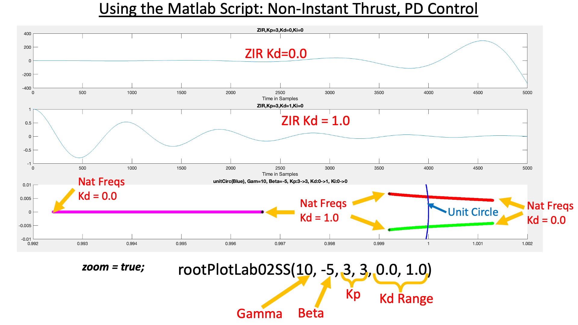 For a 2 \times 2 matrix, eigenvalues are easily computed by hand, but a system that models both derivative feedback AND a non-instant command to acceleration model will be larger, and its eigenvalues too time-consuming to compute by hand. So we've included a matlab script to do the computation, which we describe below.