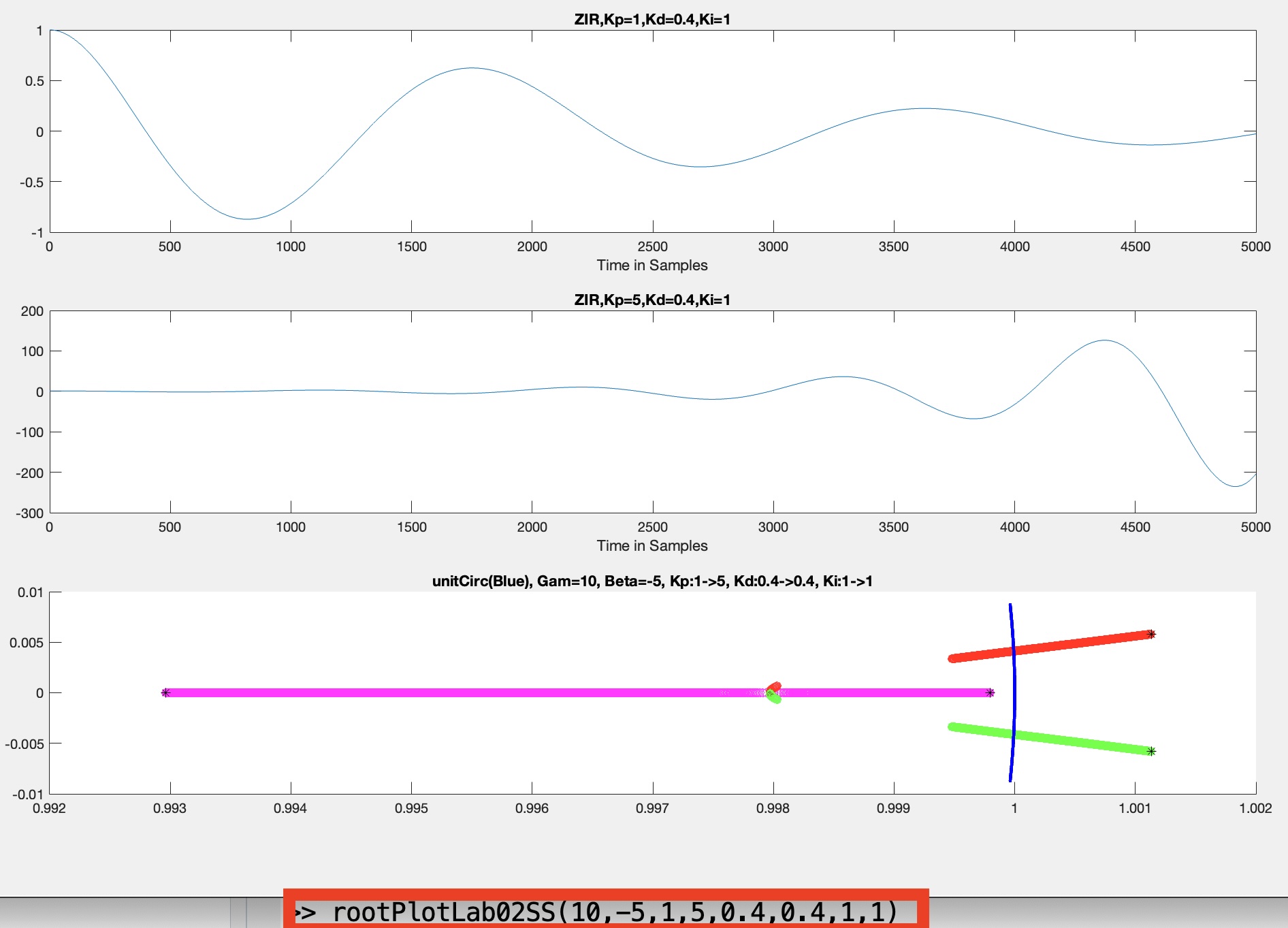 For the rest of this lab, we will focus on using our understanding of natural frequencies to calibrate progressively more complete models of a propeller arm system with PID control. We have included a vector difference-equation based matlab script (rootPlotLab02SS, linked on the top of this page) that you can use to examine initial condition responses and parameterized plots of natural frequencies. The former is most helpful when calibrating the model and the latter more helpful during controller design.
