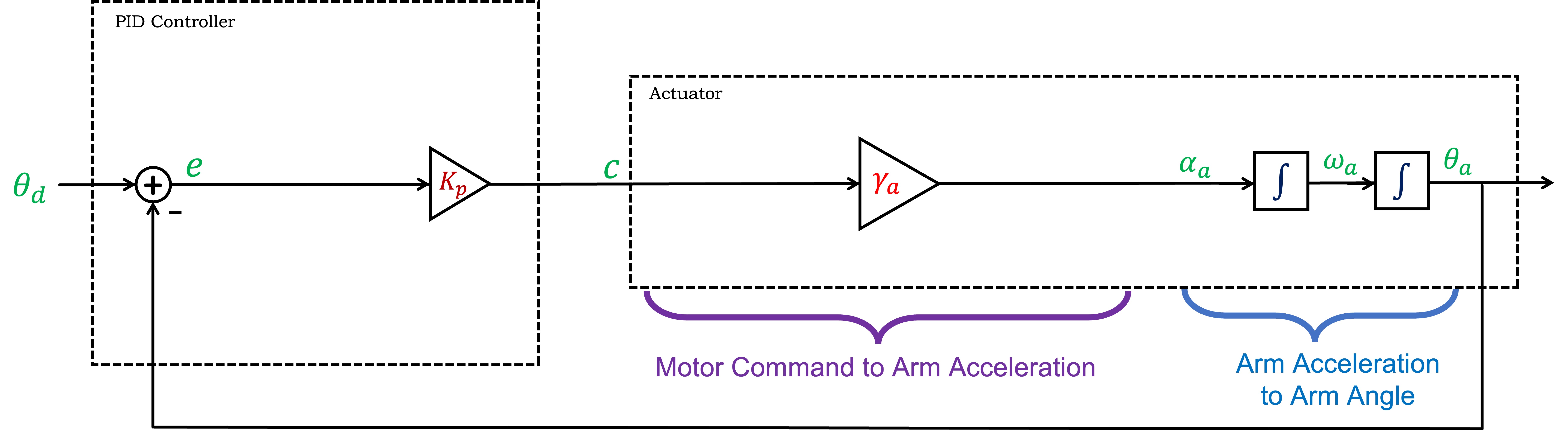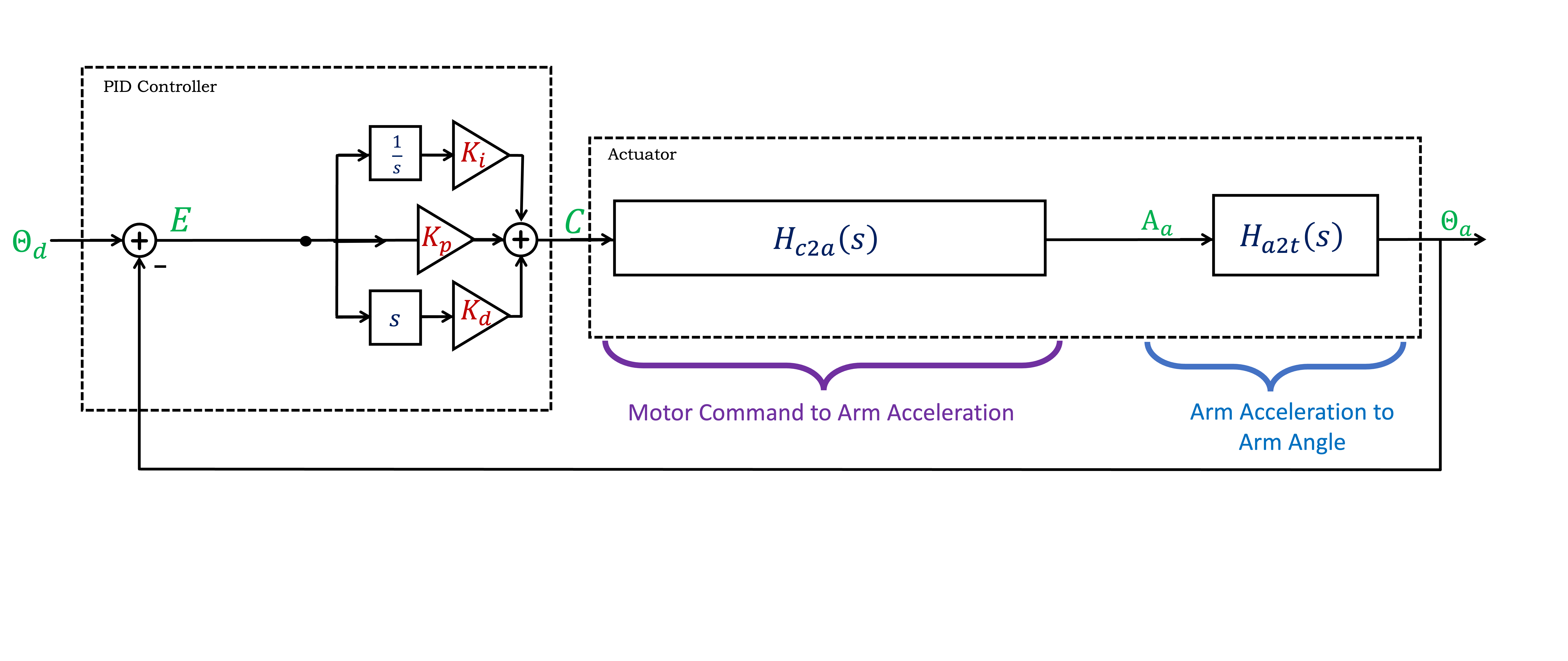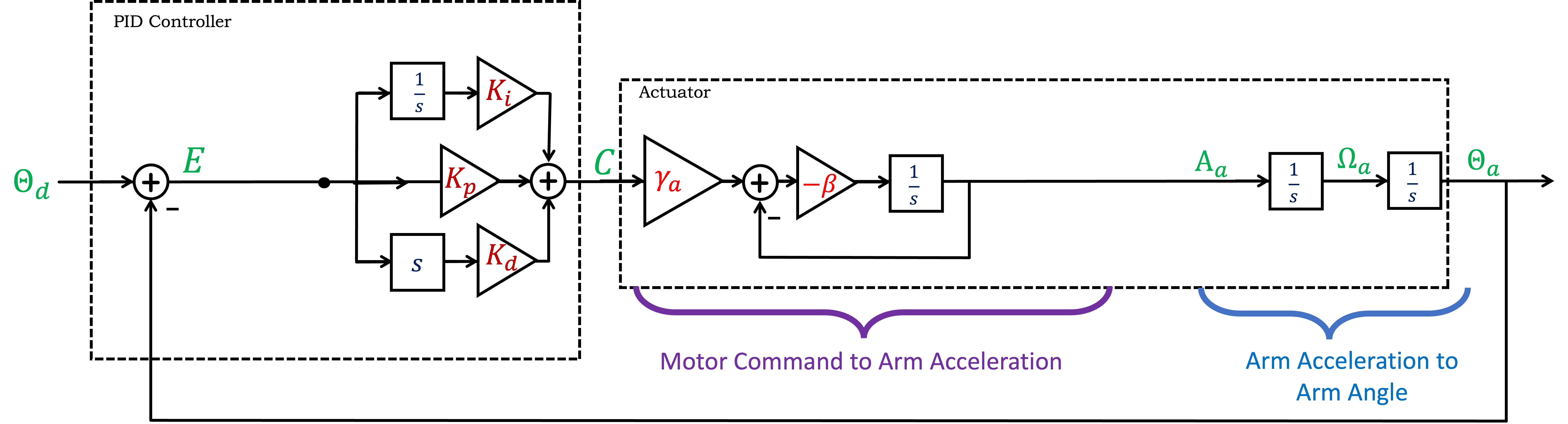 Note that even though we are representing the arm control system with a CT block diagram, the derivative and integral controller terms will still be approximated on the microcontroller using scaled angle error differences and running sums. Nevertheless, we will continue to approximate the DT behavior with a CT representation, because we can model the system with simple block diagrams and develop intuition and insight.