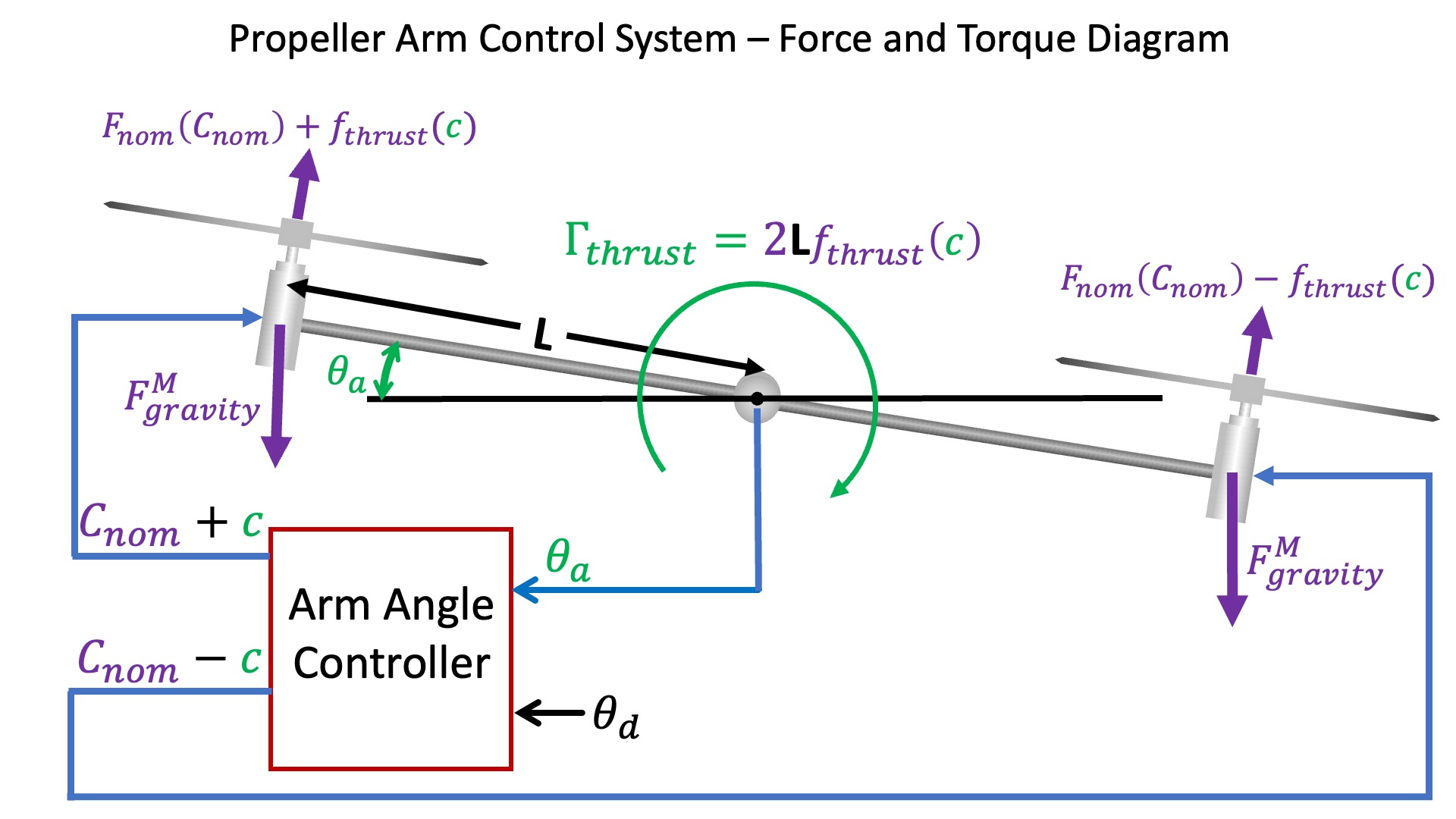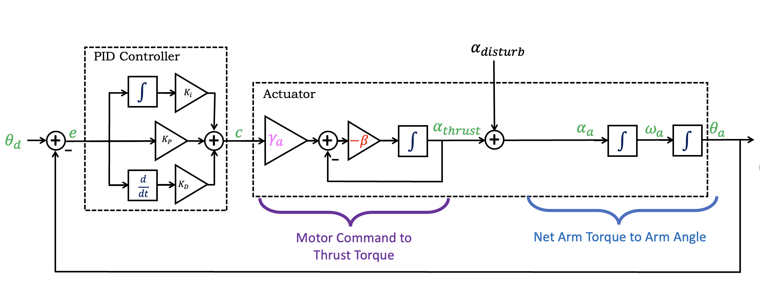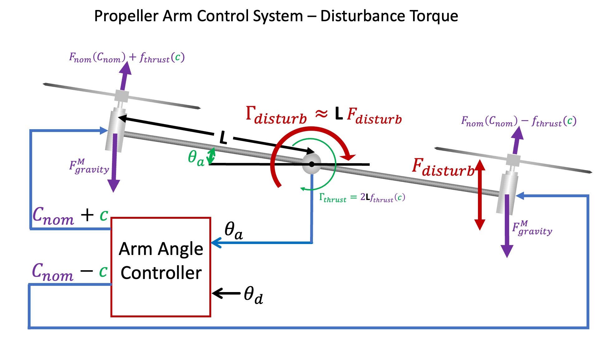 Notice that we introduced \alpha_{thrust}, the acceleration due to the thrust torque generated by the motor-propeller pairs, and added a disturbance acceleration, \alpha_{dist} (as might be generated by "dropping" or "fanning"). Then the sum of two accelerations becomes the arm angular acceleration.