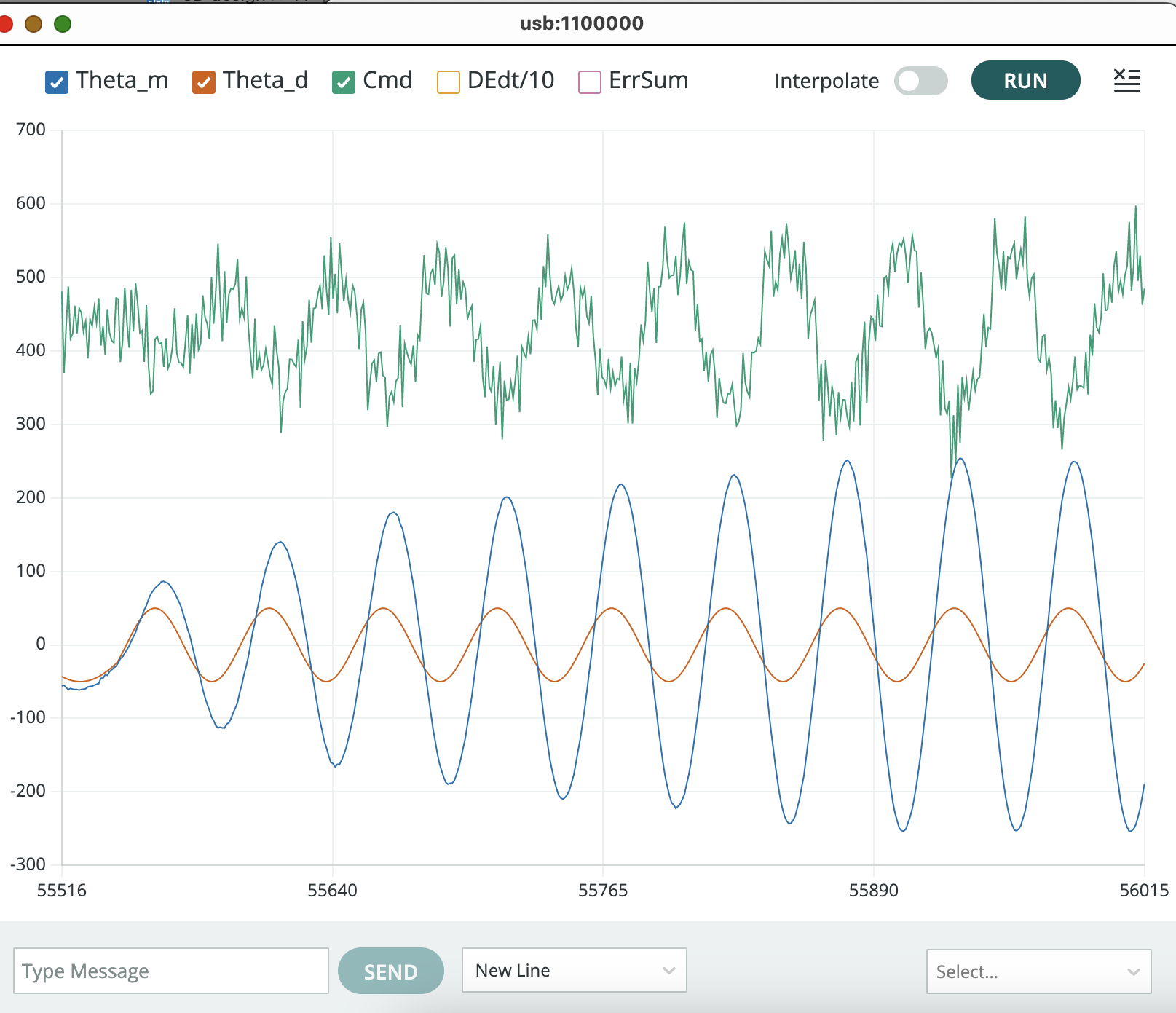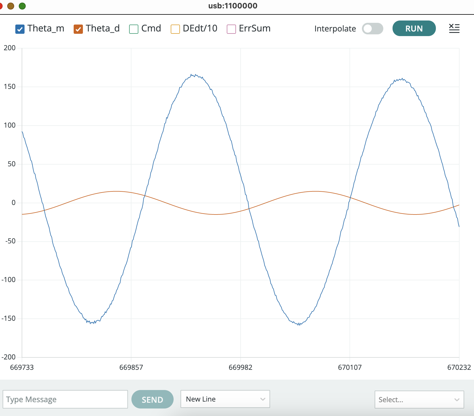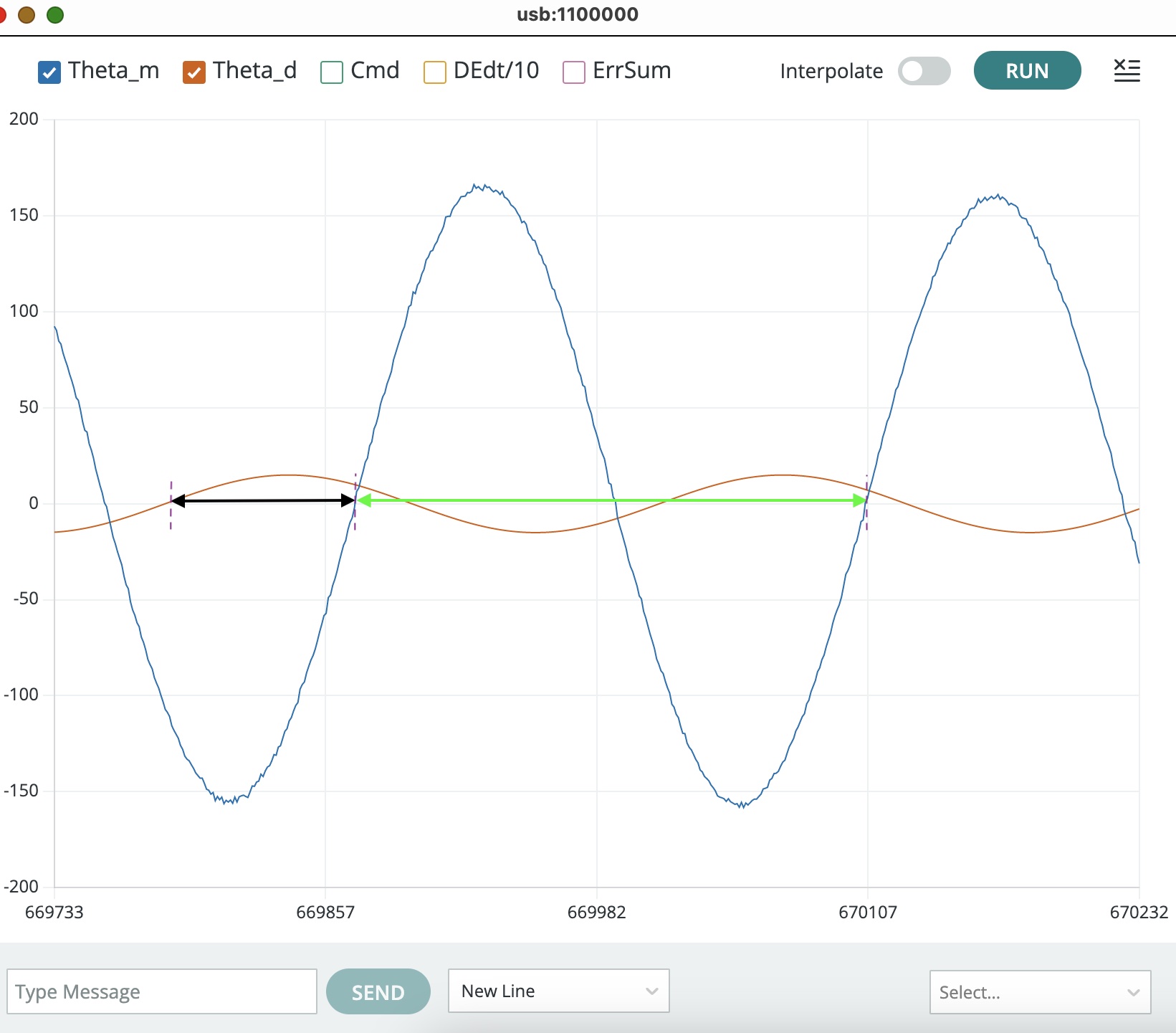 In last week’s lab, we sent an update to the serial plotter every 10 milliseconds. For this week, the sketch default is to send an update to the serial plotter every 20 milliseconds. At higher sinusoidal frequencies, it may be helpful to decrease the time between plotter updates to measure time more accurately. The control algorithm runs every millisecond, so the fastest serial plotter update is once per millisecond (zero skips). To set the fastest update rate, type "4 -19" into the plotter send window (as was done to generate the plot below). Note that the default offset for number of skips is set to 19 in the code. As another example, to update the serial plotter every 10 milliseconds, we want to skip 9 samples so type "4 -10" (to reduce 19 skips to 9) in the plotter send window.