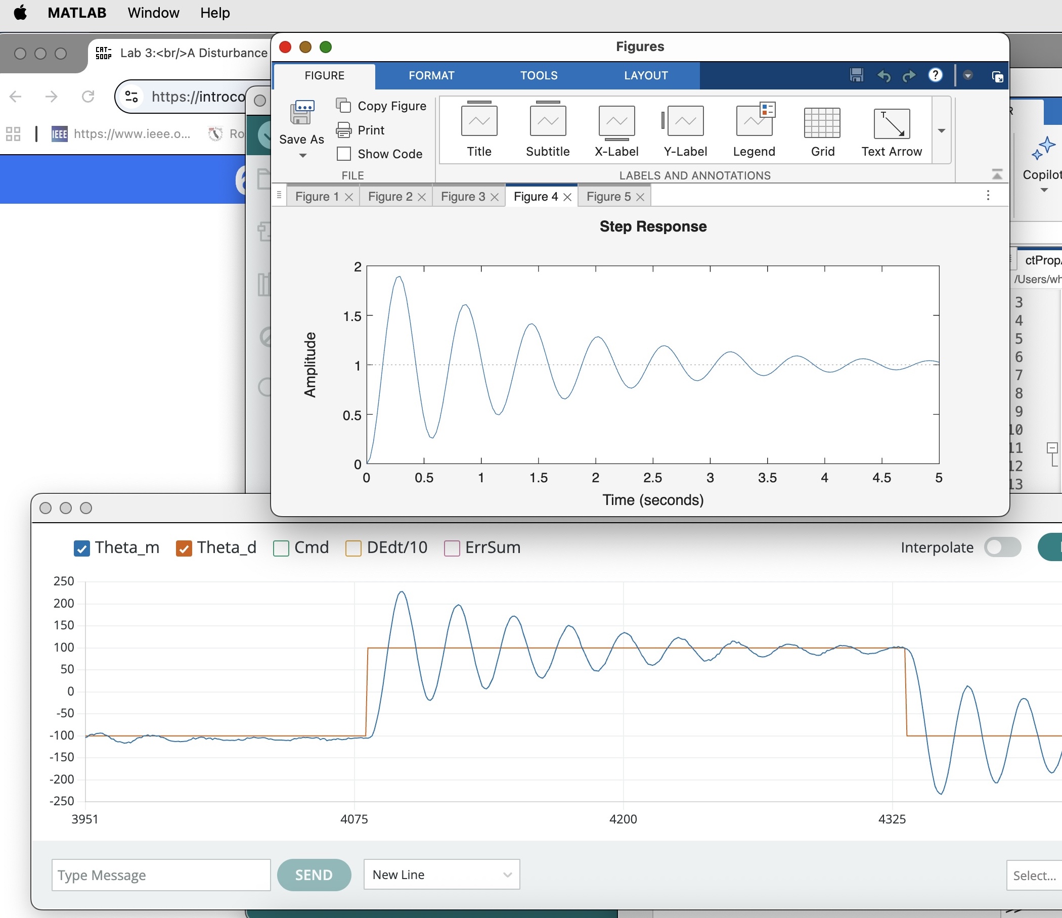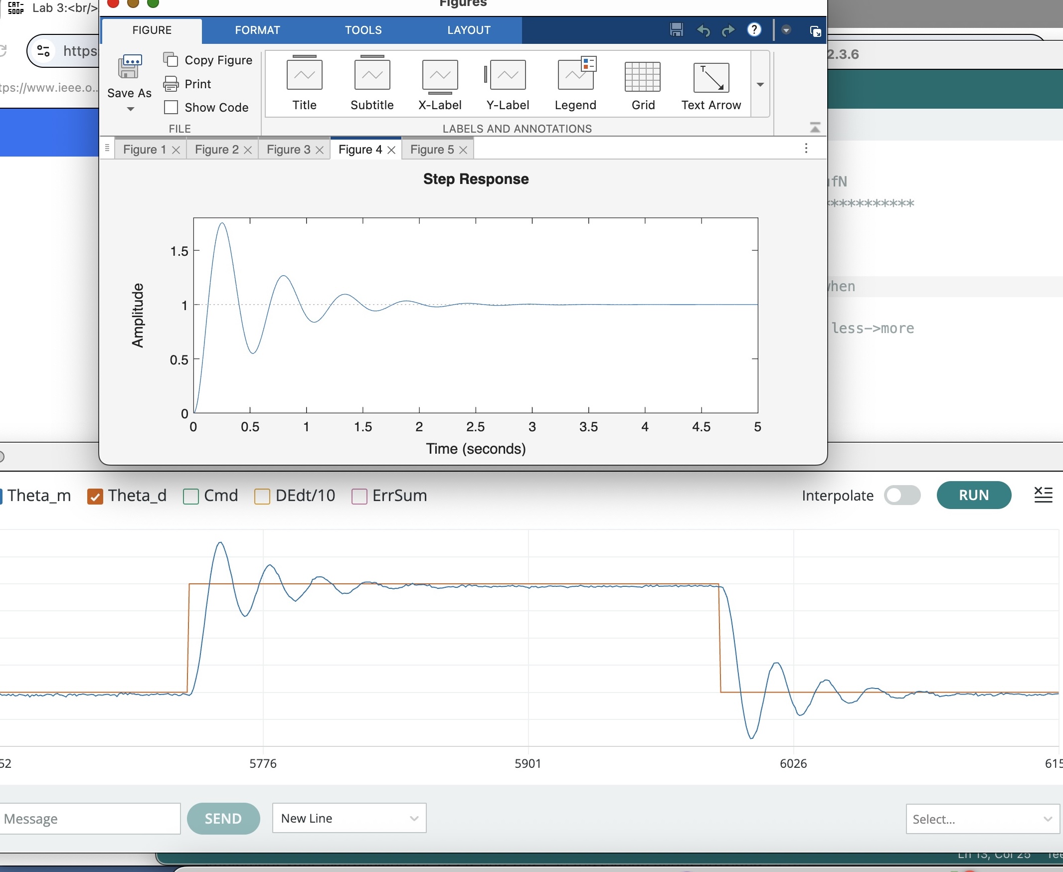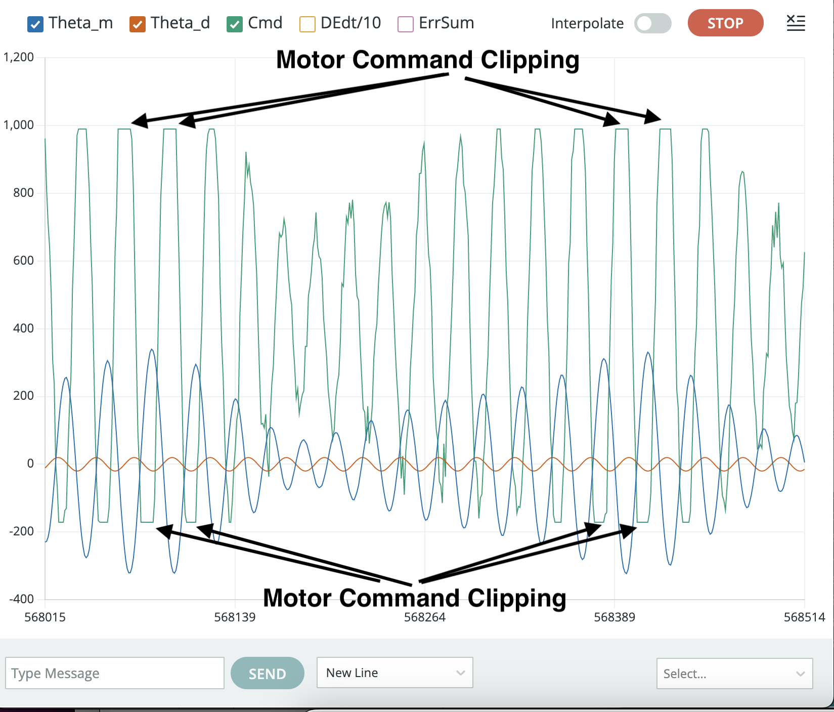 In last week’s lab, we sent an update to the serial plotter every 10 milliseconds. For this week, the sketch default is to send an update to the serial plotter every 20 milliseconds. At higher sinusoidal frequencies, it may be helpful to decrease the time between plotter updates to measure time more accurately. The control algorithm runs every millisecond, so the fastest serial plotter update is once per millisecond (zero skips). To set the fastest update rate, type "4 -19" into the plotter send window (as was done to generate the plot below). Note that the default offset for number of skips is set to 19 in the code. As another example, to update the serial plotter every 10 milliseconds, we want to skip 9 samples so type "4 -10" (to reduce 19 skips to 9) in the plotter send window.