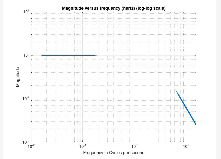 NOTE: For some versions of Linux, the on-line matlab produces disconnected plots for the rescaled plots, like the example below. If you see this, you can just use the non-rescaled Bode plots, but remember that the x axis in those plots is in radians per second, not cycles per second, and must be scaled by 2 \pi.