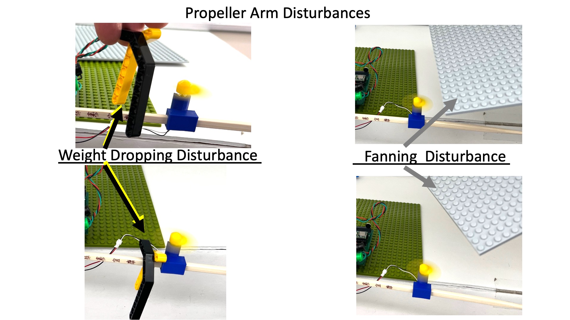 For the propeller arm, we have examined two example disturbances, dropping weight and fanning, as shown in the image below.