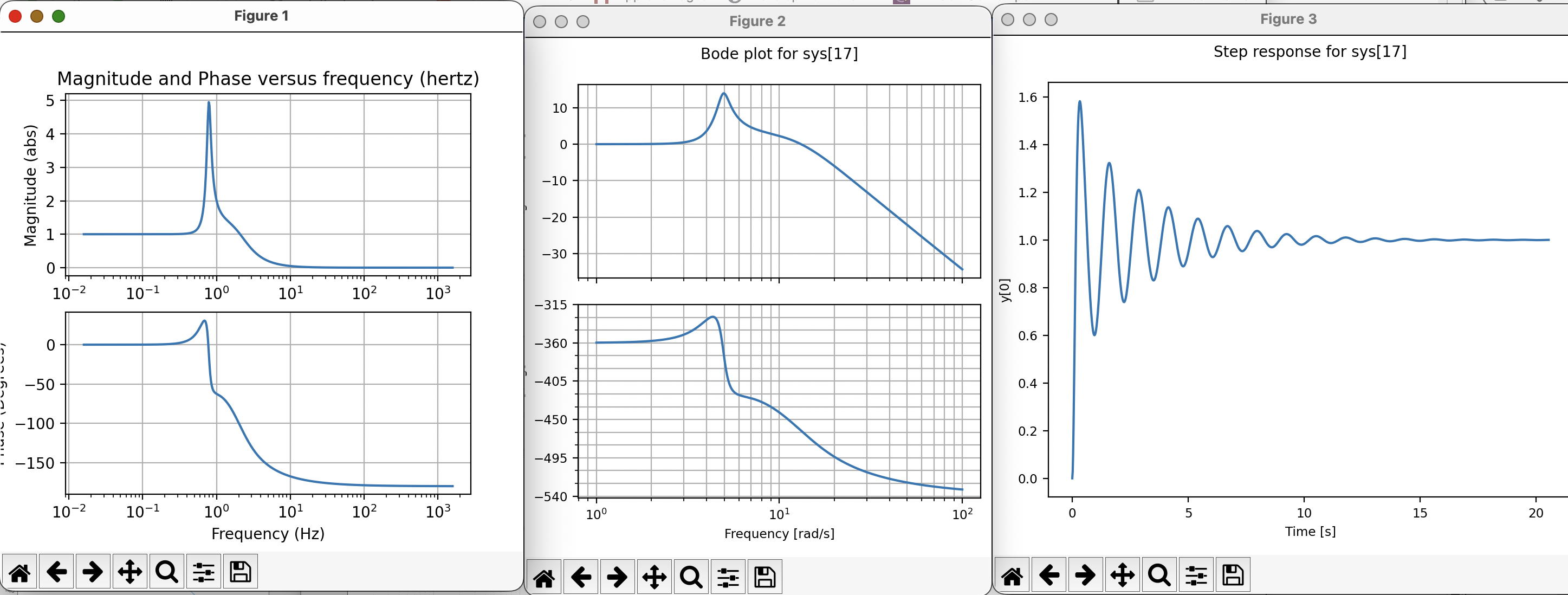 Running the script after you have corrected the transfer functions should produce plots like (but not exactly like) the ones below. On the left is our rescaled Bode plot in which magnitude is plotted directly, and the logrithmically-placed frequencies are in Hz (cycles per second). In the middle is a classic bode plot for which the magnitude is plotted using the logrithmic dB scale and frequency in radians/second. And the plot on the right shows the associated step response