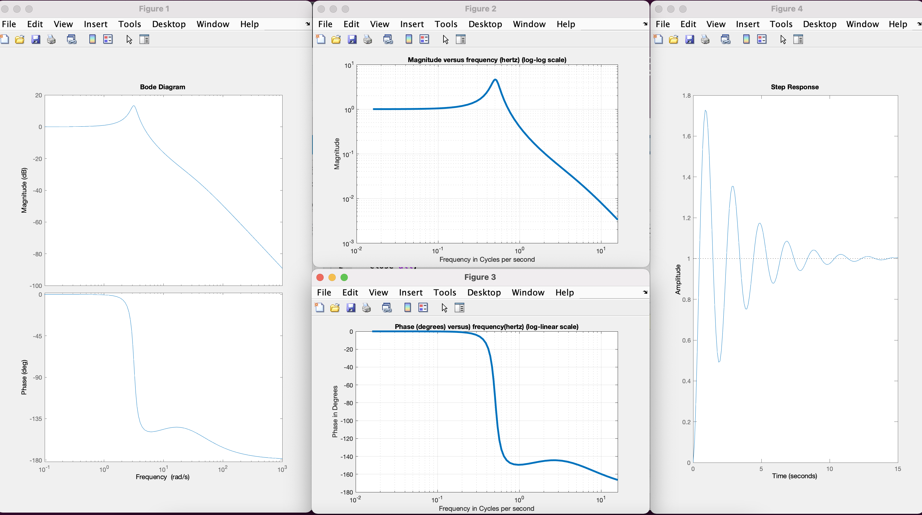 Running the script should produce plots like the ones below, showing the standard bode plots with the x axis in radians per second, our rescaled bode plots (with bolder lines) in which the x axis is in hertz (cycles per second) instead of radians, and the system step response.