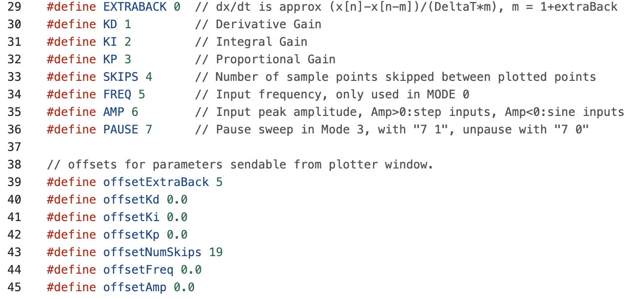 We also ask that you collect data from running a frequency sweep, see the instructions here. Please set Ki=0.0 and Kp=2.0, and find a value for Kd so that the arm's step response oscillates TWO OR THREE TIMES before settling. You should be able to find a good Kd value between 0.15 and 0.3. We also suggest using the offsets in the Teensy sketch (which start at approximately line 40, see the figure below) so that you do not have to enter the gains using the serial plotter window.