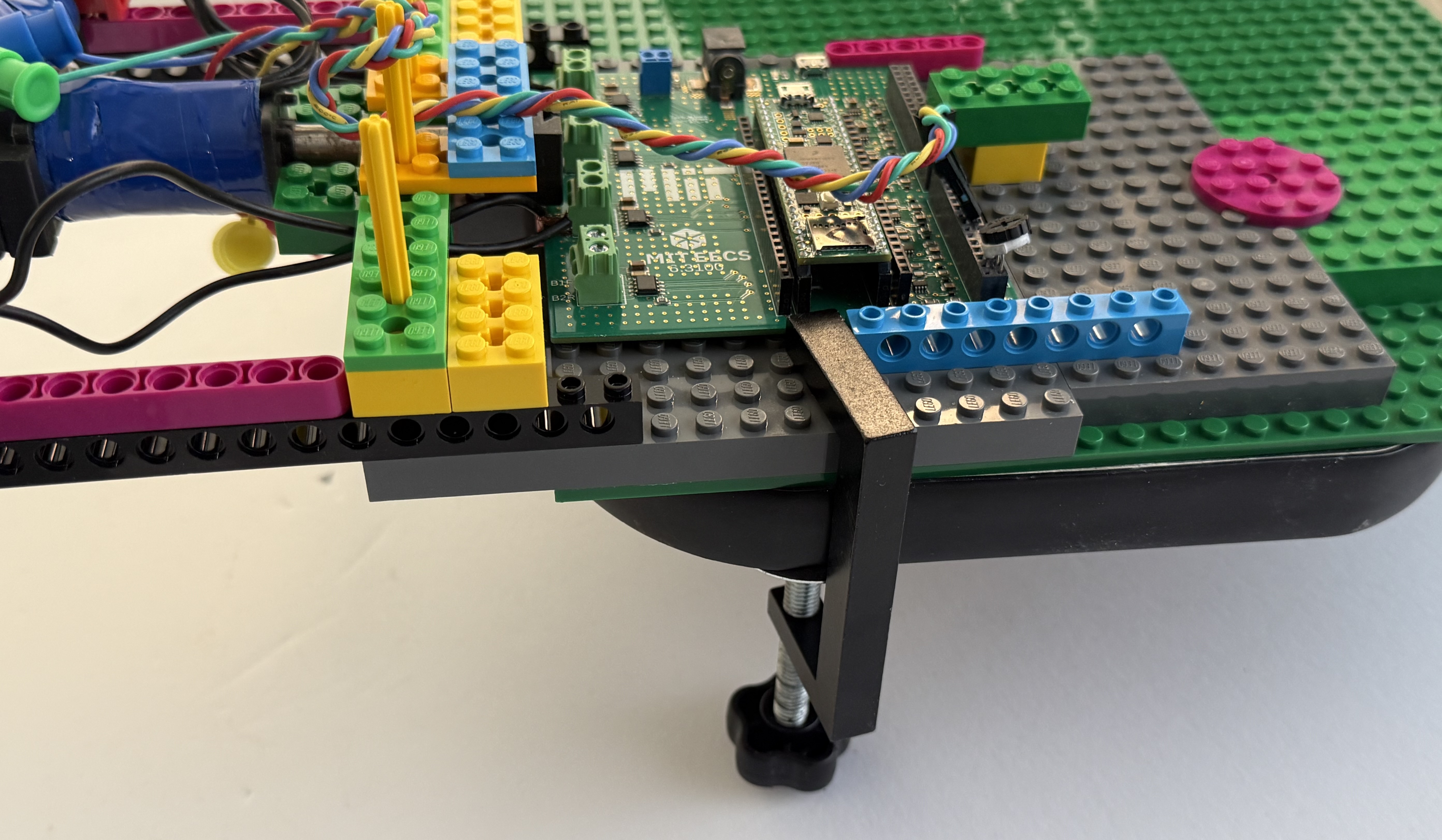 Complete the assembly of the maglev system, but clamp the maglev system to the side of you lab bench (as shown below). The clamp has enough iron to interfere with the maglev system, so if you clamp differently, be sure to keep the clamp well-separated from the electromagnet.