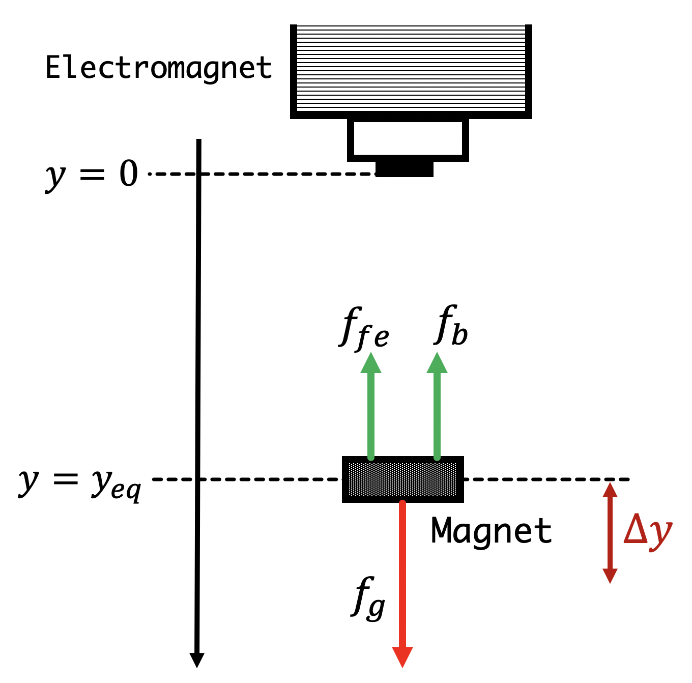 To design the controller, we could start by developing a model of the net force, a sum of a position-independent gravity force, f_g, and the position dependent forces of attraction: the force of attraction between the floating magnet and the electromagnet's iron core (in our case a steel rod), f_{fe}, and the force due to the electromagnet's field, f_b. After determining analytic expressions for each of the individual forces as a function of position, y, we could derive a formula for the total force, f(y) = f_g + f_{fe}(y) + f_{b}(y). Then armed with f(y), we could find the force-balance equilibrium position, y_{eq} such that f(y_{eq}) = 0. Finally, we could determine how to drive the electromagnet, as a function of the perturbation from equilibrium, \Delta y shown in the above figure, so that the magnet is pushed back to y_{eq}.
