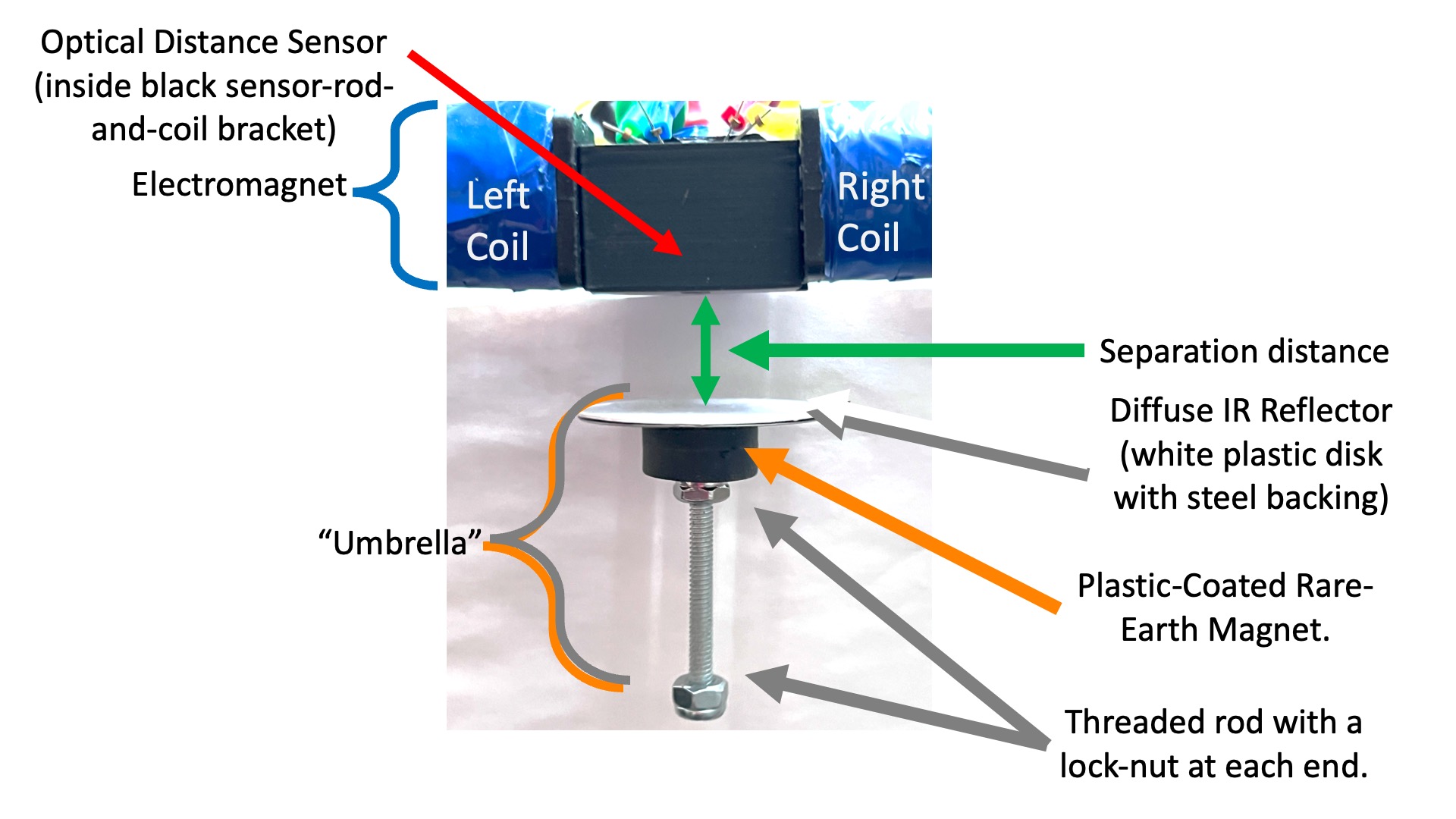 Above is a detailed picture of the electromagnet and the floating "umbrella". The "umbrella" is a plastic-coat rare-earth cube magnet (orange) that holds together a steel-backed white plastic disk and a threaded rod with lock-nut ends. The white plastic disk is a diffuse IR reflector, which makes the distance sensing less sensitive to umbrella tilting. The disk's steel backing has a mirrored surface that is a more efficient reflector, but also more directional, and makes the distance sensing too sensitive to umbrella tilt. The threaded rod with lock-nut ends acts as a tilt stabilizer, much like the tail on a kite.