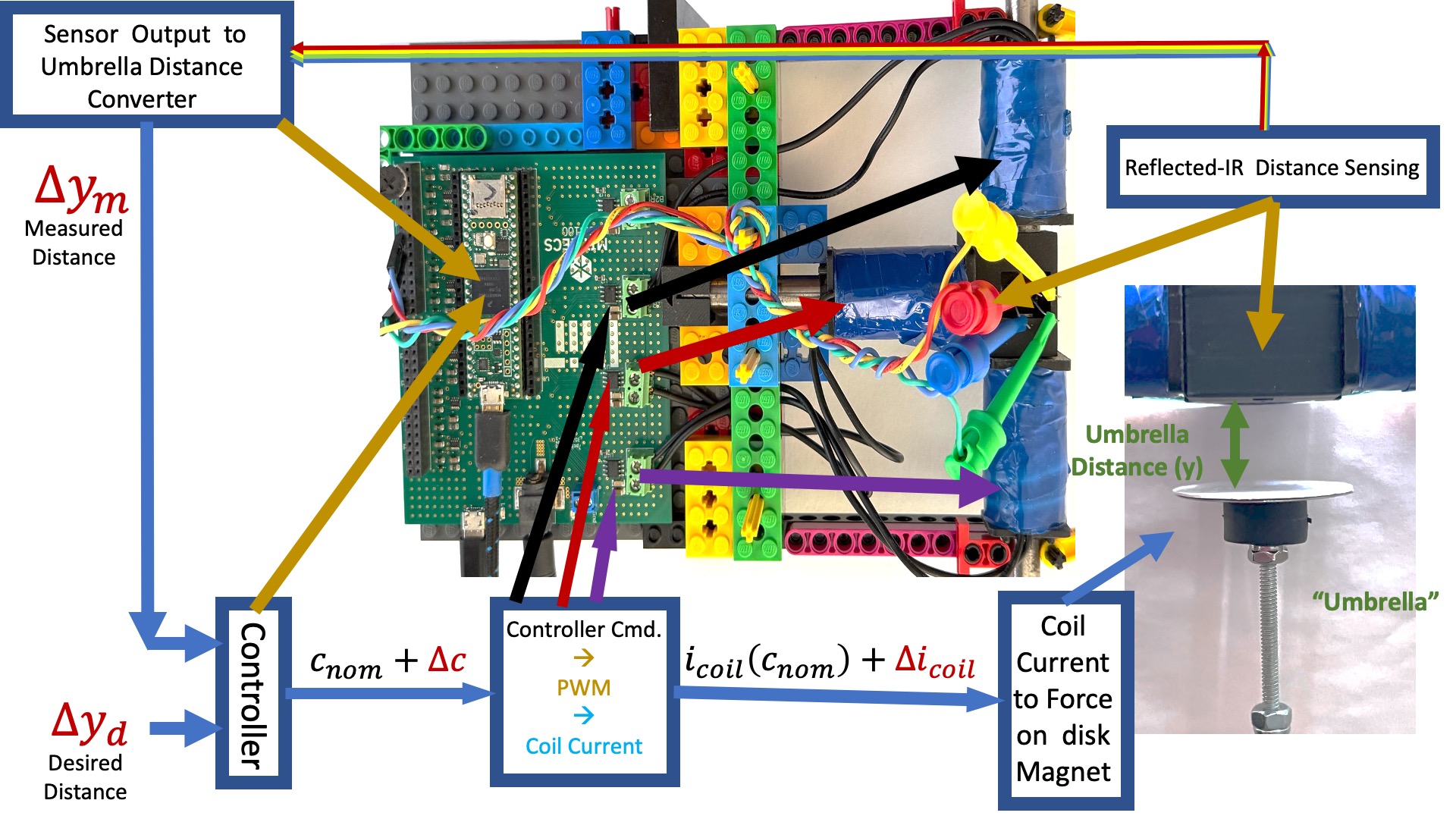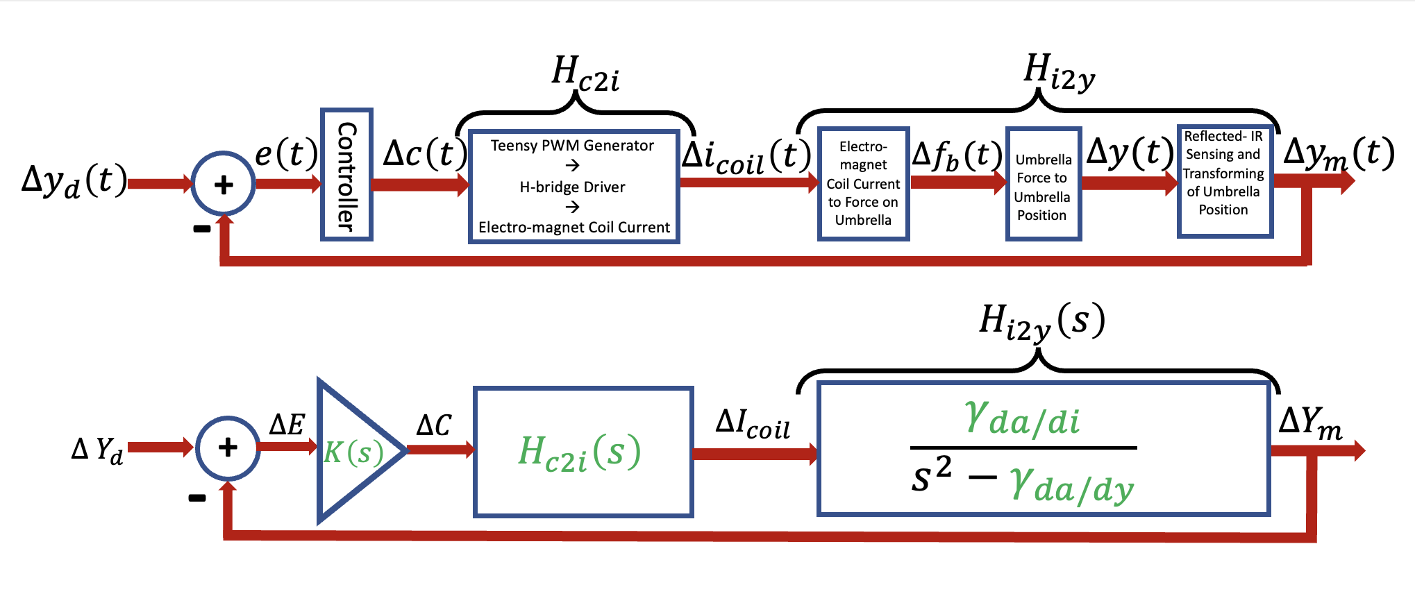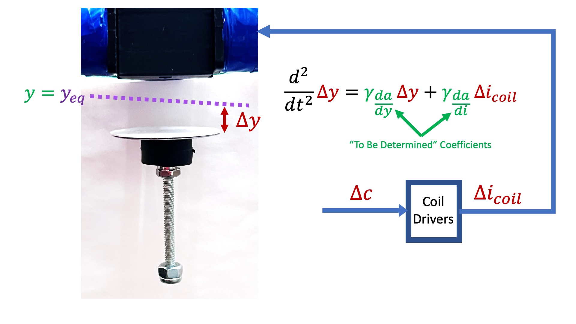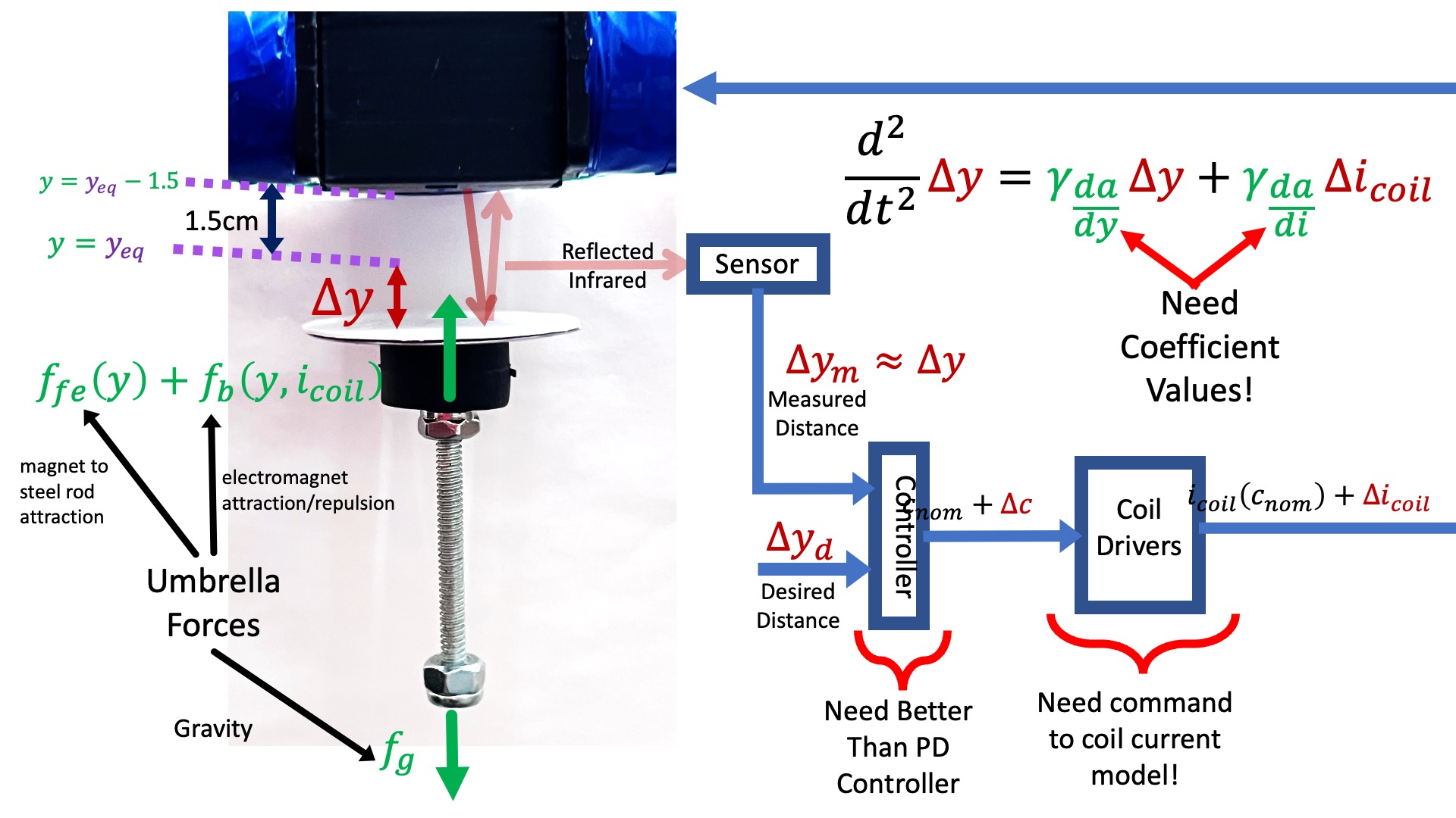 Note that, compared to the previous lab, f_b is defined as being dependent on the electro-magnet's coil current rather than its field. As a result, our linearized model has \gamma_{\frac{da}{di}}, which relates perturbations in coil current to perturbations in umbrella acceleration, along with \gamma_{\frac{da}{dy}}, which relates perturbations in umbrella position to perturbations in umbrella acceleration.