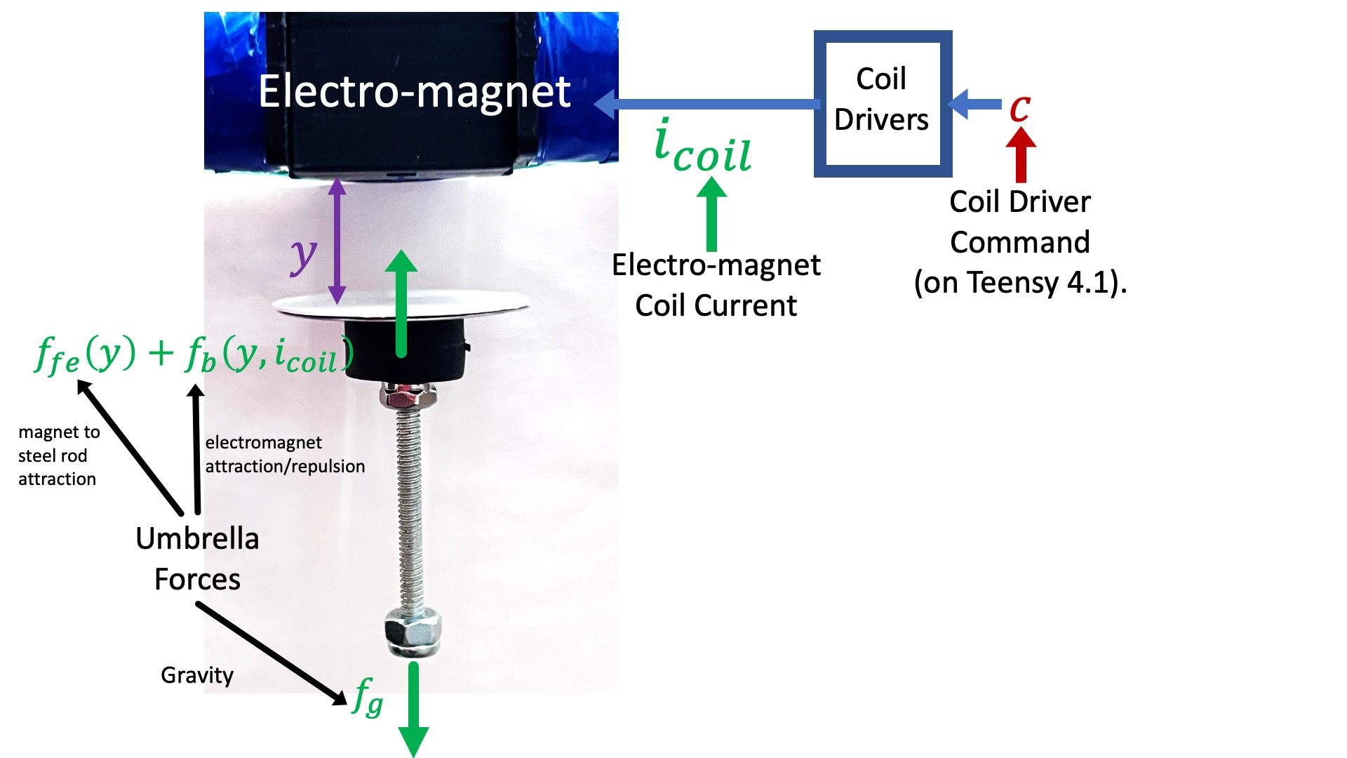 In the figure above, we note the forces acting on our magnetic "umbrella": a position-independent gravity force, f_g; a position-dependent force attracting the cube magnet to the electro-magnet's steel core, f_{fe}(y); and a coil-current and distance-dependent attracting/repelling force between the cube magnet and the electro-magnet f_b(y,i_{coil}). Recall that for our solenoid-type electro-magnets, magnetic field is proportional to coil current, making them interchangable up to a scale factor.