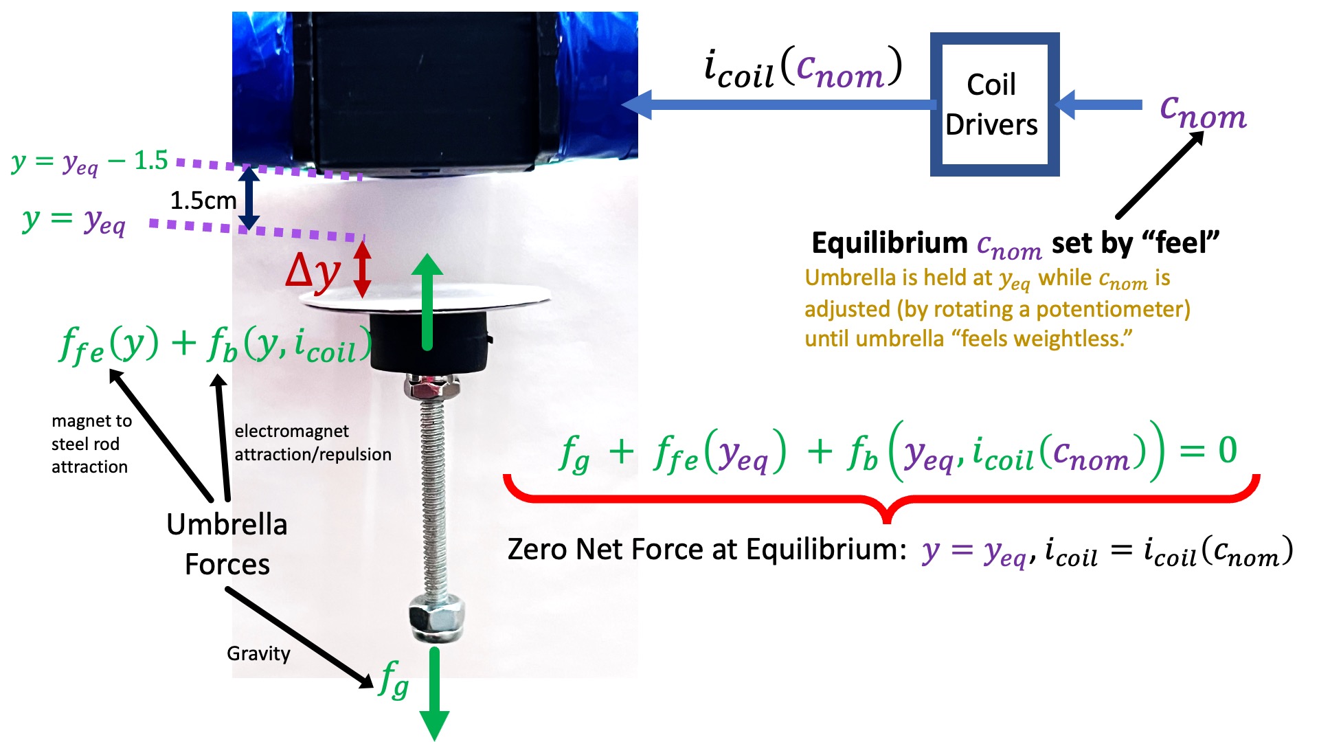 - establish an umbrella equilibrium position, y = y_{eq}, 1.5 centimeters below the electro-magnet;