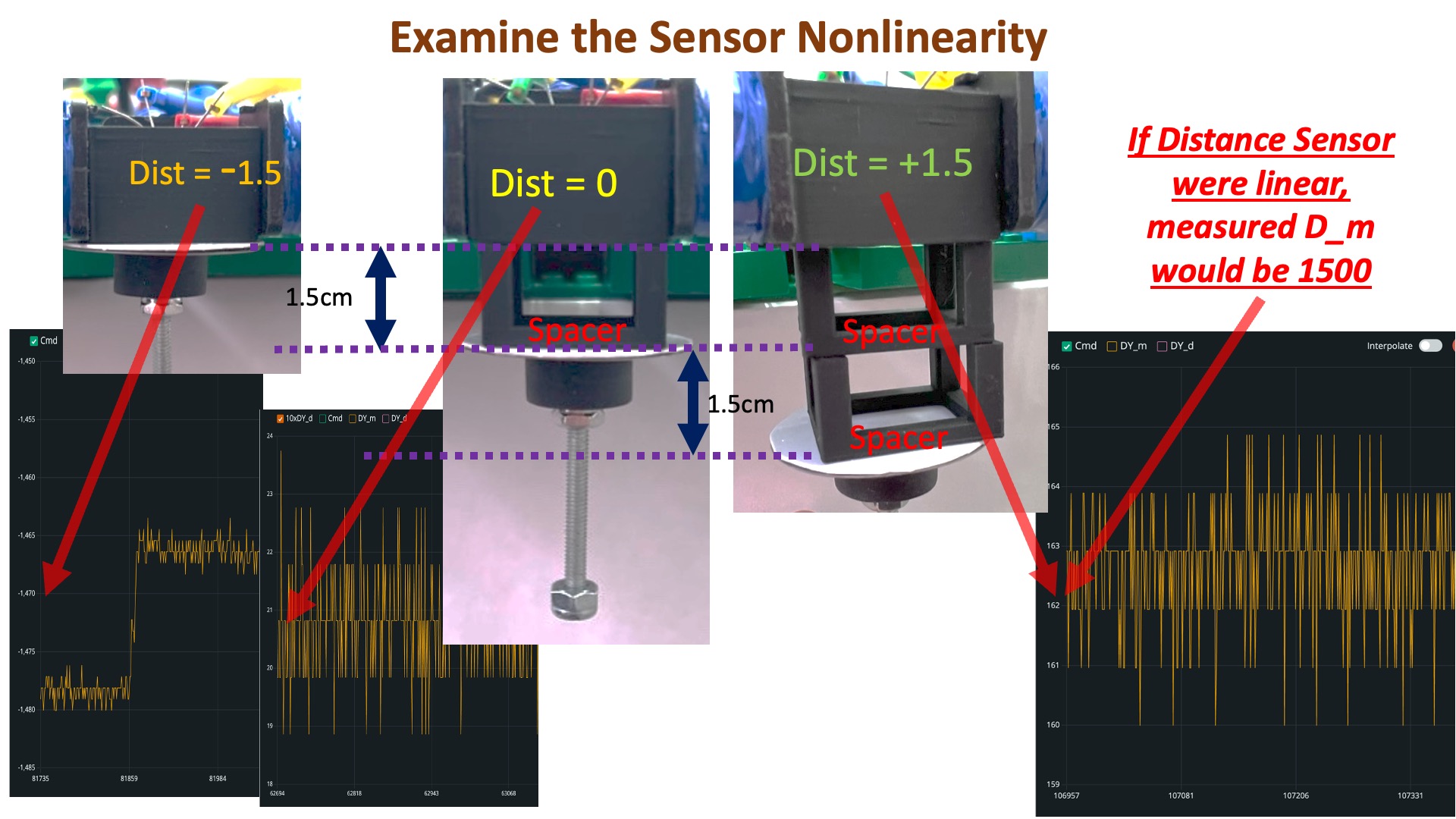 In the previous lab, we calibrated a nonlinear relationship between \Delta y and the optical distance sensor voltage (see lines 177, 178 the in Teensy sketch). Please be sure to recalibrate that relationship.