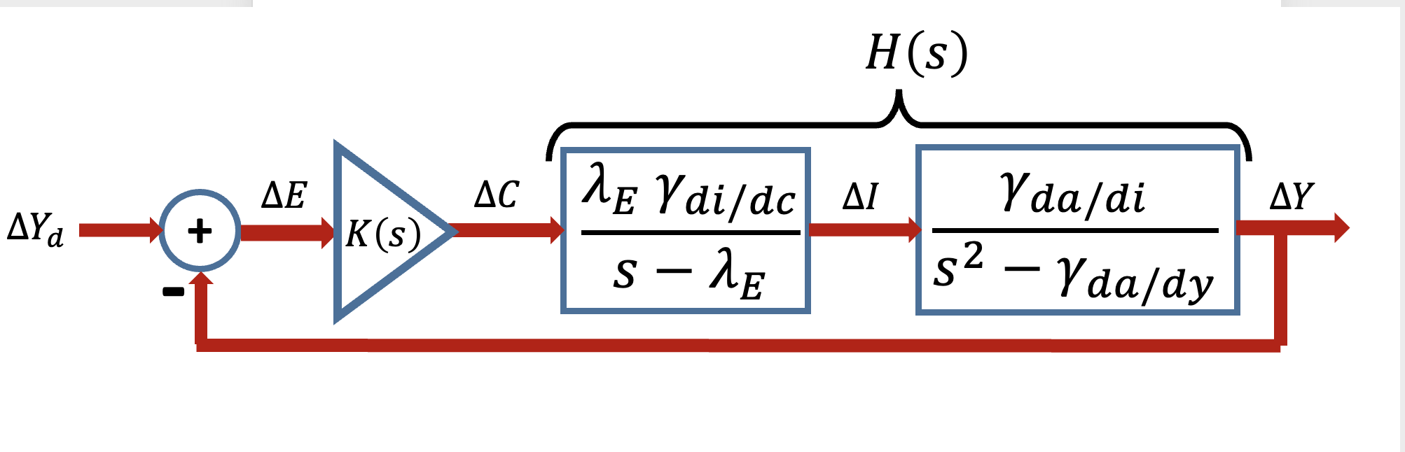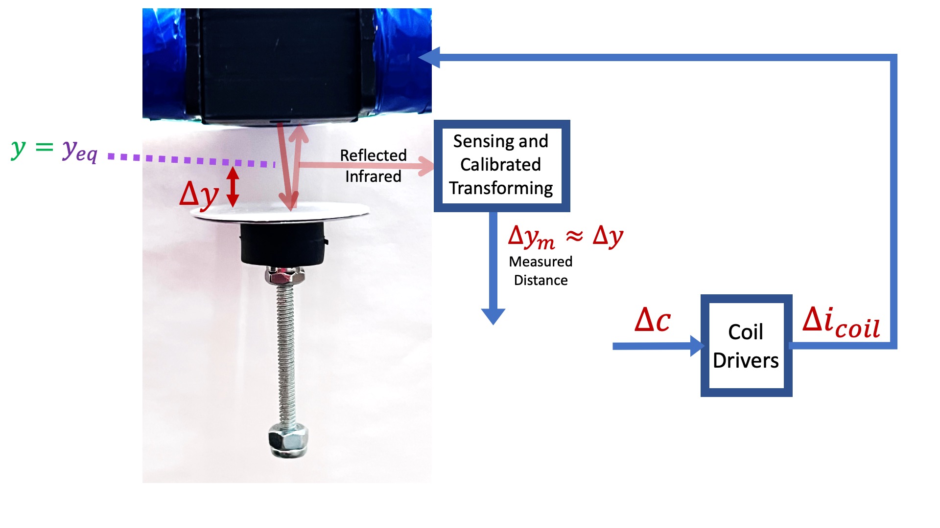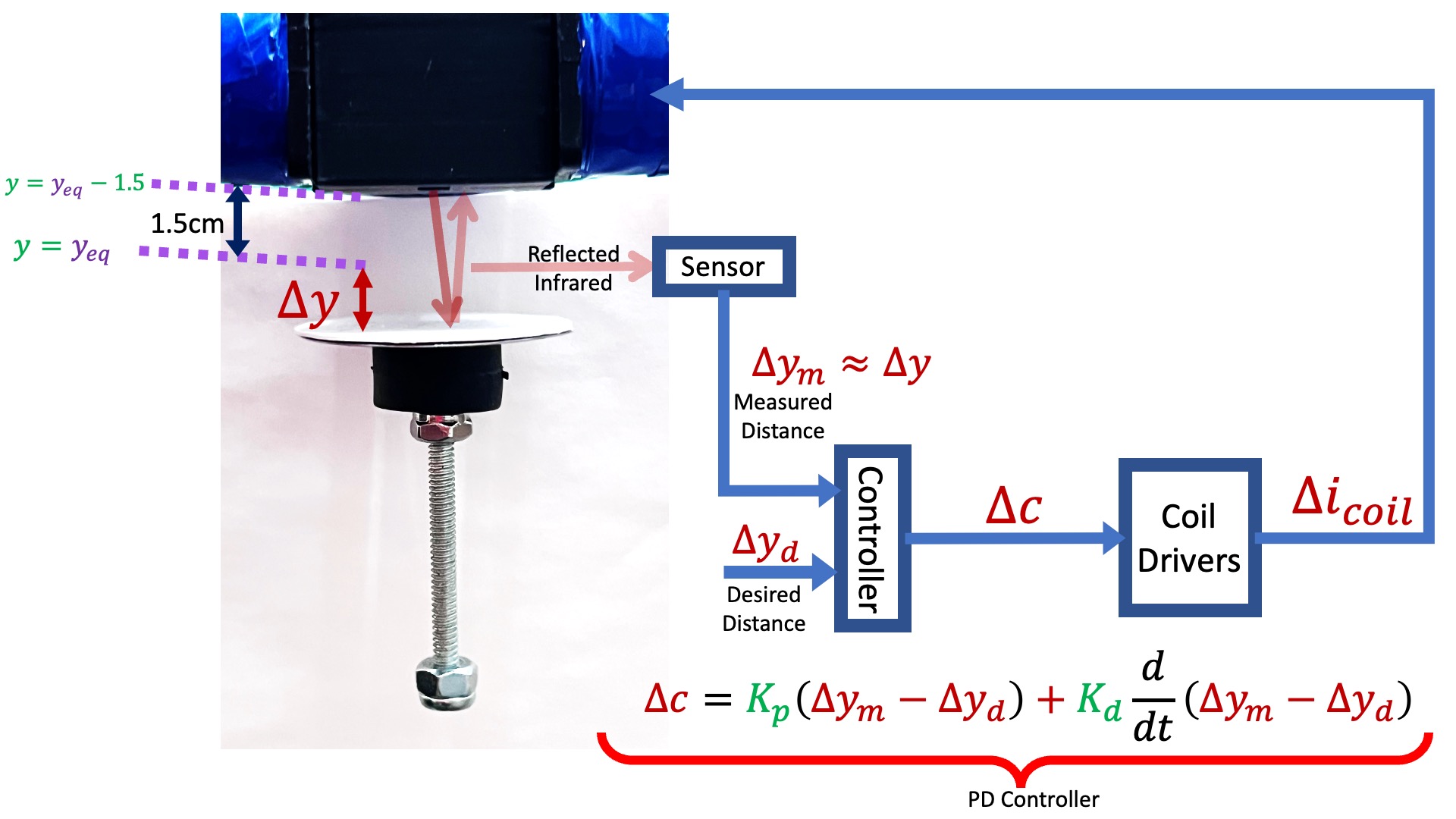 The above block diagram is the transfer-function based model of the linearized maglev system, including the second-order transfer function relating changes in coil current, \Delta I, to changes in separation distance \Delta Y , and the one-pole model relating changes in Teensy command \Delta C to changes in the electro-magnet coil current \Delta I .