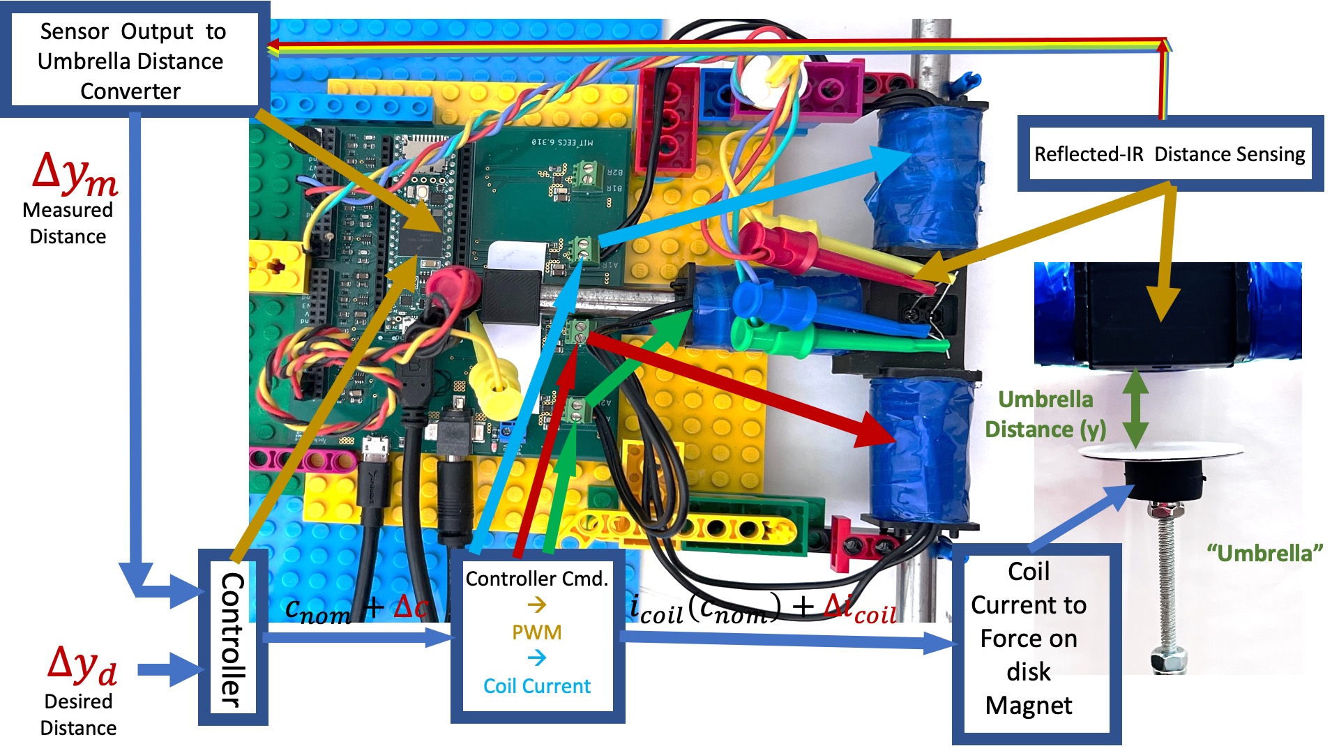 The transfer function abstraction clarifies (in green) what we are missing: the two parameters in the transfer function relating coil current to umbrella position; H_{c2i}(s), which relates controller command, c, to coil current, i_{coil}; and of course the improved controller, K(s).