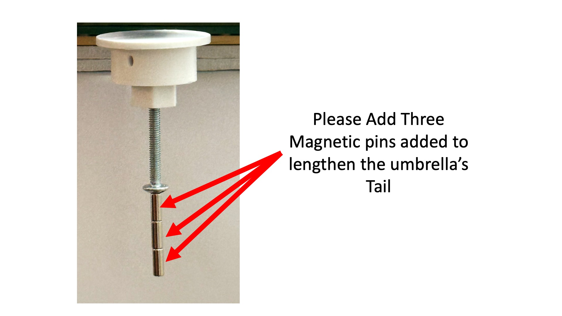 IMPORTANT SECTION!!The maglev hardware is too sensitive to umbrella rocking, which makes calibrating a model very difficult. To reduce the rocking, please add a longer "tail" to the umbrella, by adding three pin magnets as in the picture below.