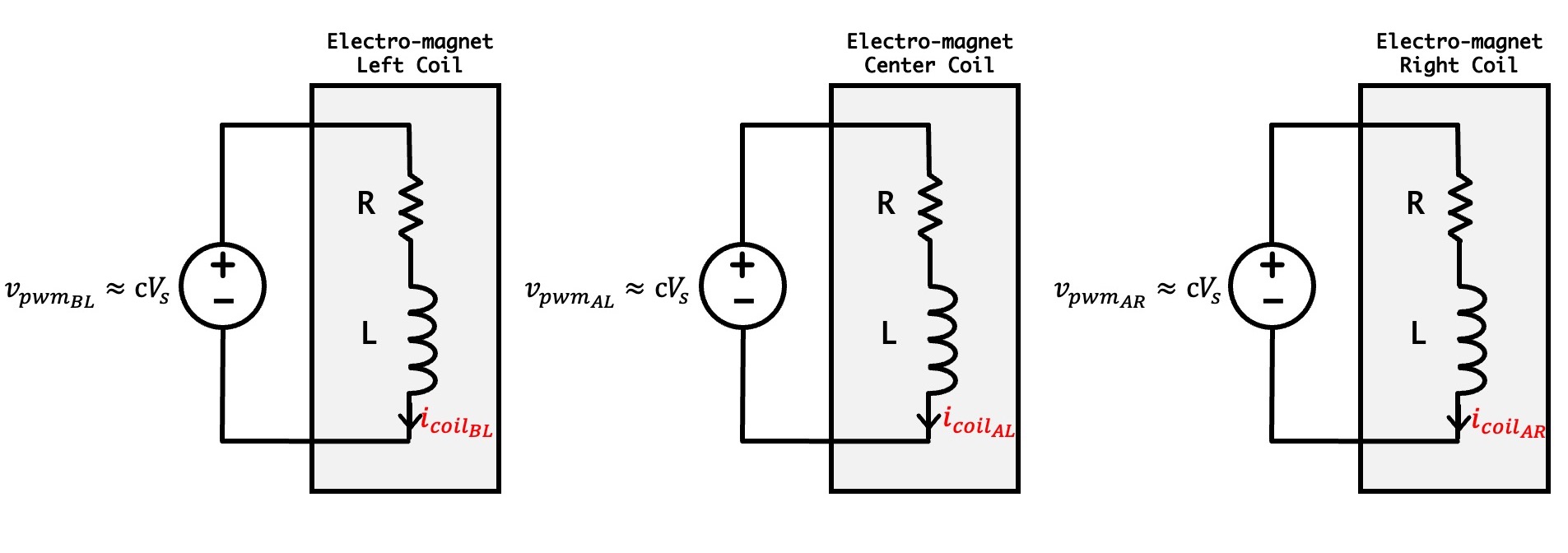 - three voltage sources, v_{pwm_{BL}}, v_{pwm_{AL}}, and v_{pwm_{BR}}, which model the three H-bridge coil drivers and