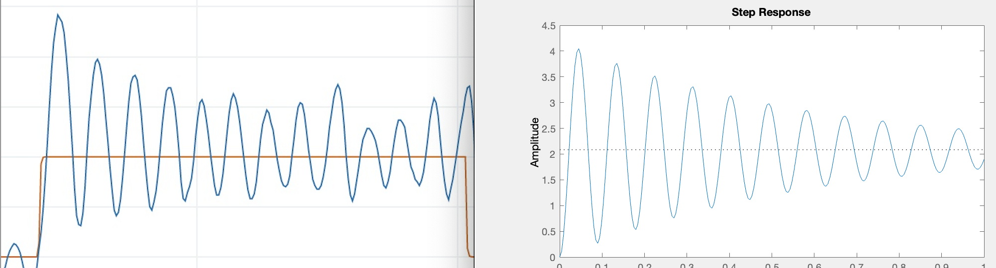 In the figure above, we show annotatation for a plot extracted from the Arduino serial plotter, generated by running the maglev control system with a PD controller. The plot, a comparison of the quasi-steady-state peak-to-peak amplitudes of the desired (red) and measured (blue) umbrella positions, can be used to determine \gamma_{da/dy}. Try determining the formula for the step response steady-state, and then matching.