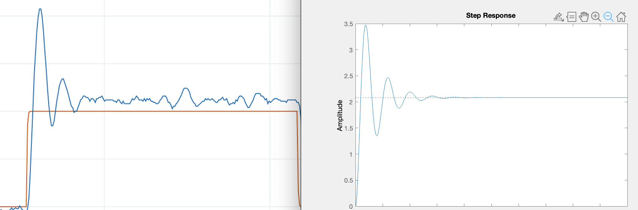 Below we compare PD controller step responses with step responses computed with a well-calibrated matlab model, for K_d = 0.8*K_{d0}, K_d = K_{d0}, K_d = 1.4*K_{d0}, for our optimized K_{d0} and K_p.