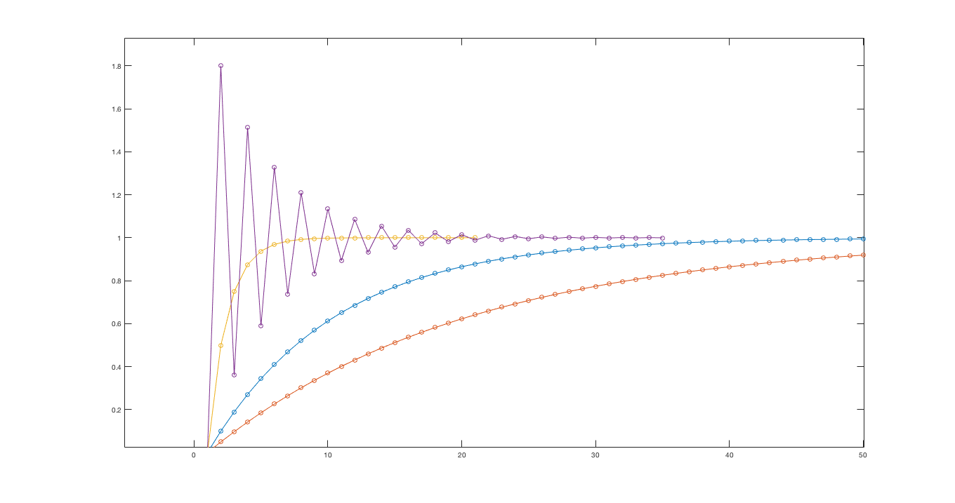 The arrows in the red curve of figure 3 show the path of the natural frequencies with increasing gain. As the plot shows, with increasing gain, the natural frequency moves from close to one, toward zero, then toward negative one, and finally outside the unit circle. The step responses for the system, in figure 4, show the same trend as the gain increases. As the gain rises, the transient becomes faster and faster as the natural frequency approaches zero, and when it passes zero and becomes negative, the step response becomes oscillatory. For even larger gains, the system becomes unstable.