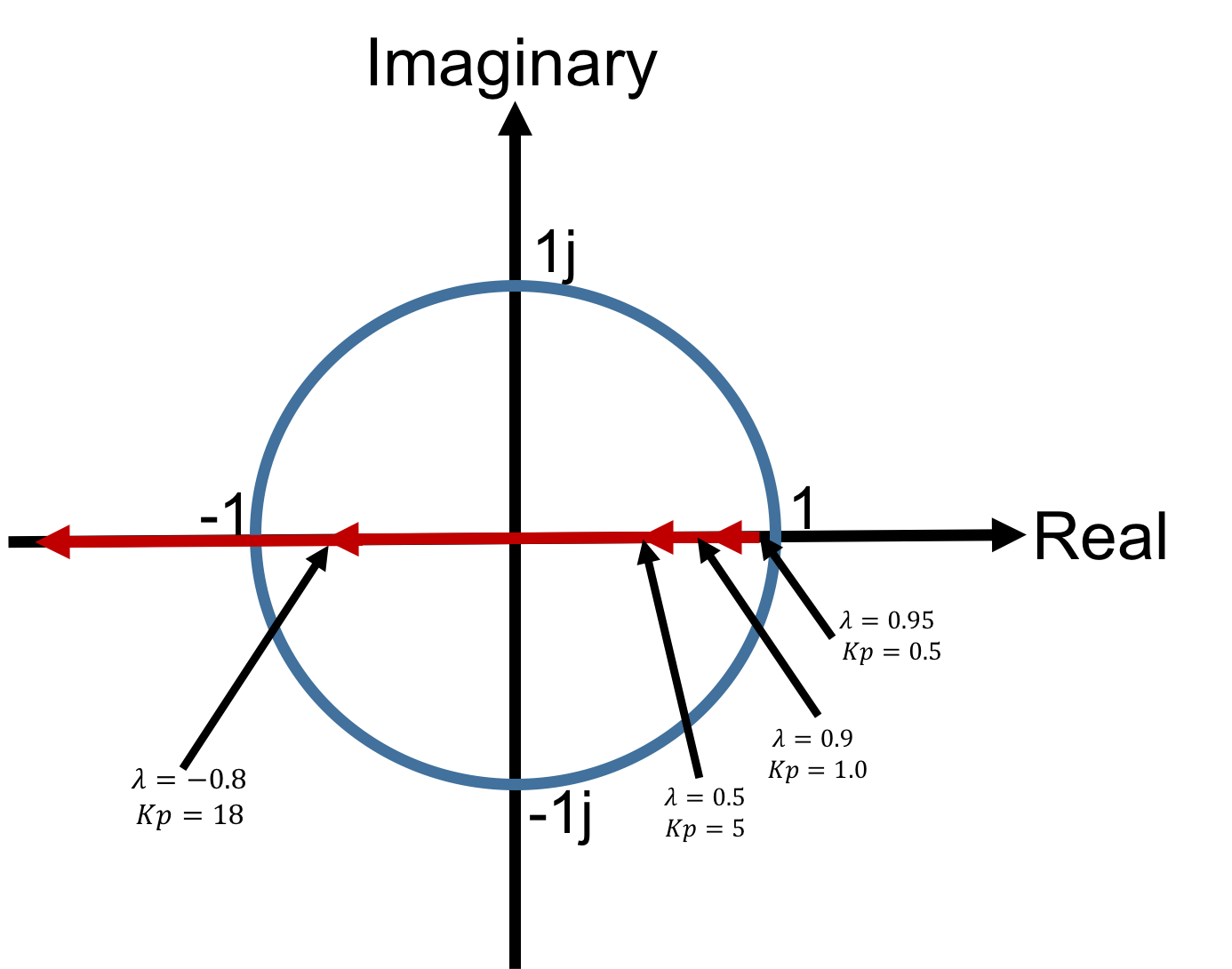 The points in the plot below are the natural frequencies for different gains in the crane system. Note that the plot shows the natural frequencies as points in the complex plane (x-axis for real, y-axis for imaginary), even though they are real for first-order systems. As we will see once we start examining second-order systems, natural frequencies are the roots of system-specific polynomials, and in general are complex. Also, we refer to plots like figure 3 as root-locus plots, because the curves in the plots are formed from the "locus" of roots of the polynomials generated by sweeping a system's feedback gain from zero to infinity. Finally, root-locus plots for discrete-time systems often explicitly denote the unit circle |\lambda| = 1, because a system with a natural frequency outside the unit circle is unstable.