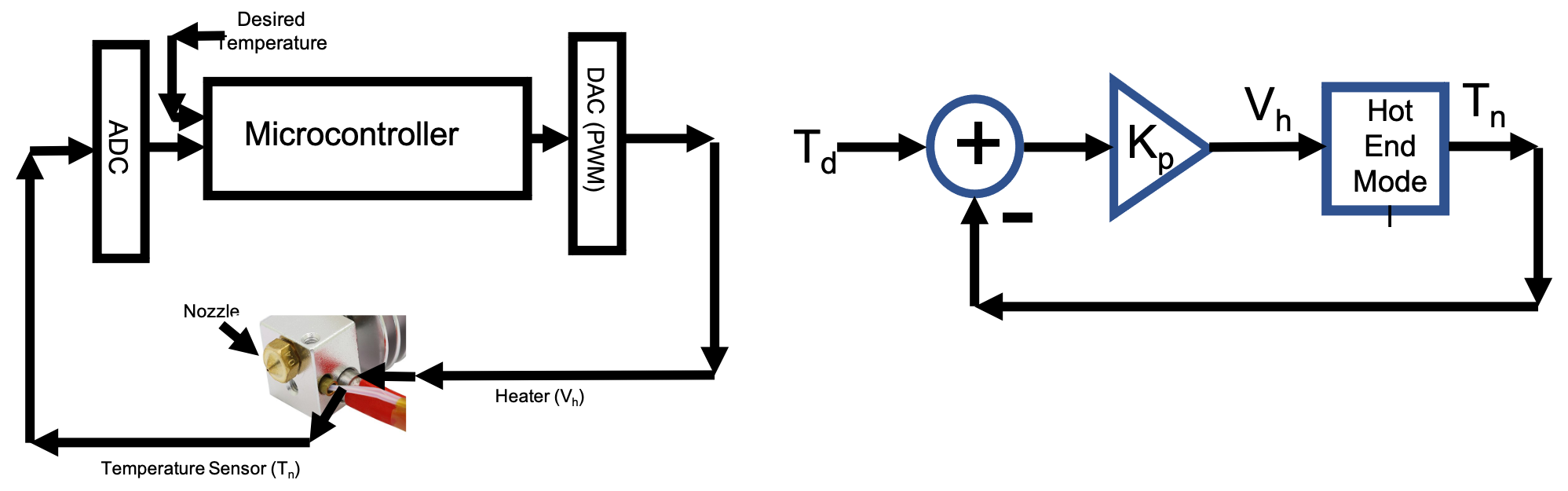 Suppose we wish to design a feedback control system for the hotend, one that keeps the nozzle at T_{n} by adjusting the voltage, V_{h} on the nozzle heater based on measurements from the nozzle temperature sensor. A diagram of the connections and a mathematical block diagram are shown in the figure below.