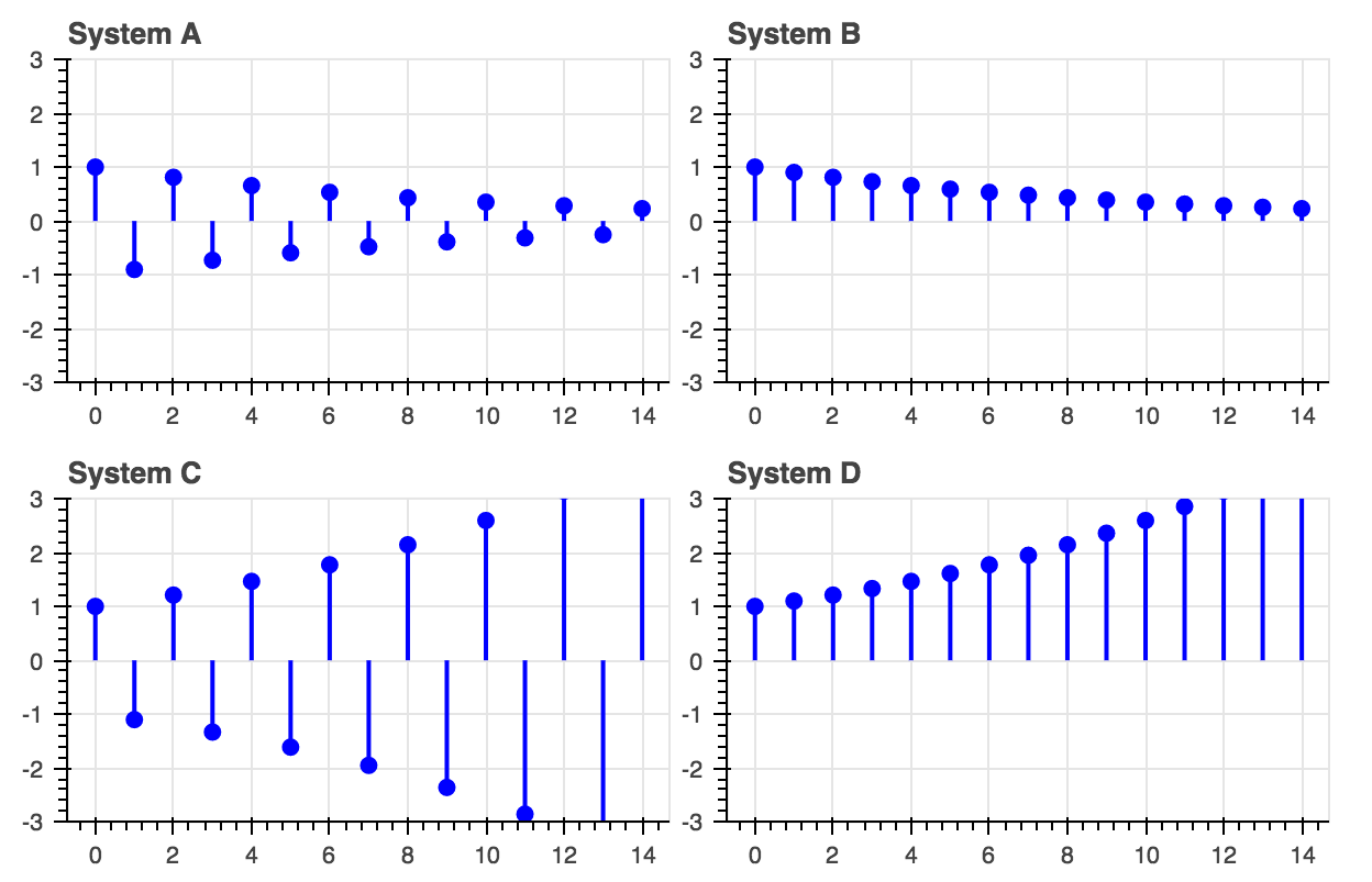 For the following problems, assume that y[n] = \alpha_1 y[n-1], and consider the following stem plots of the sequence y[n].