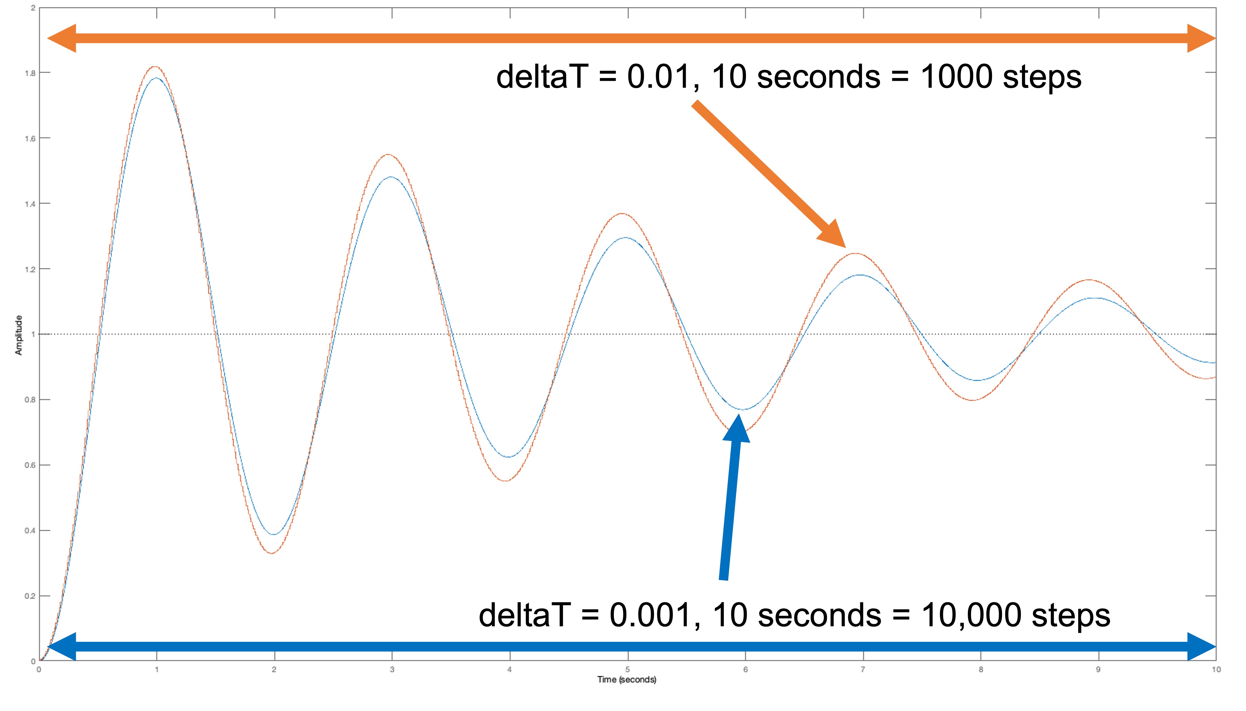 If you examine the natural frequencies for the \Delta T = 0.001 case, the situation APPEARS worse, because the largest magnitude \lambda's for the \Delta T = 0.001 case are slightly larger than for the \Delta T = 0.01 case. However, if one plots step responses from both cases on the same time axis (as below), they appear to be nearly identical.